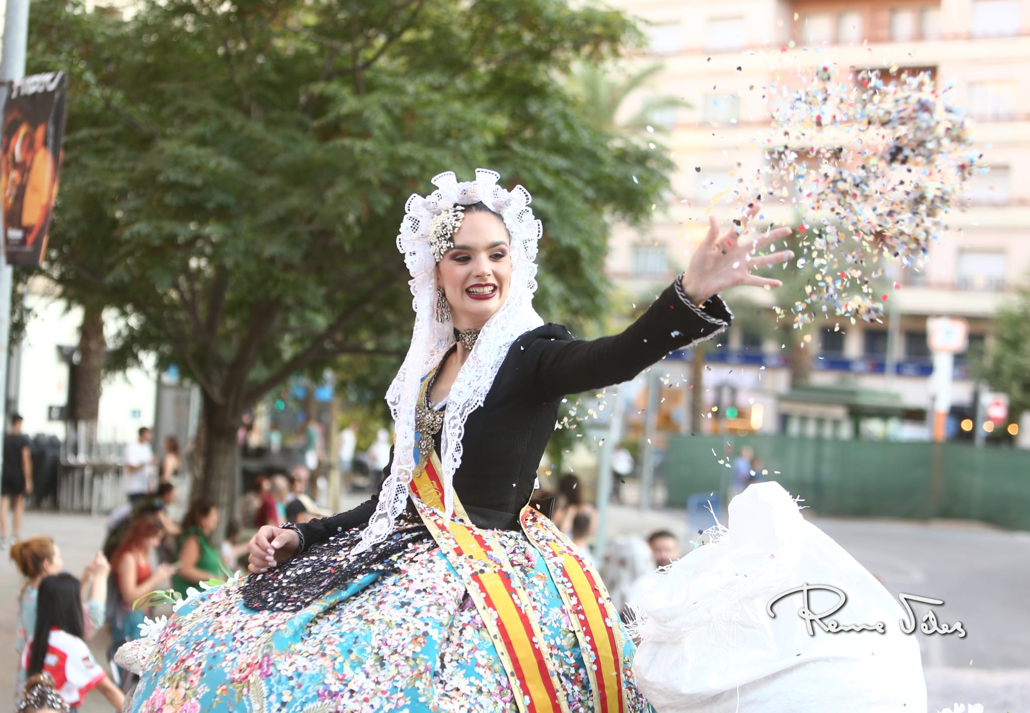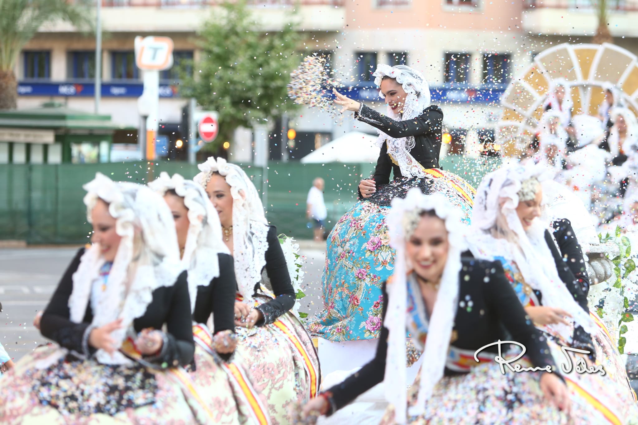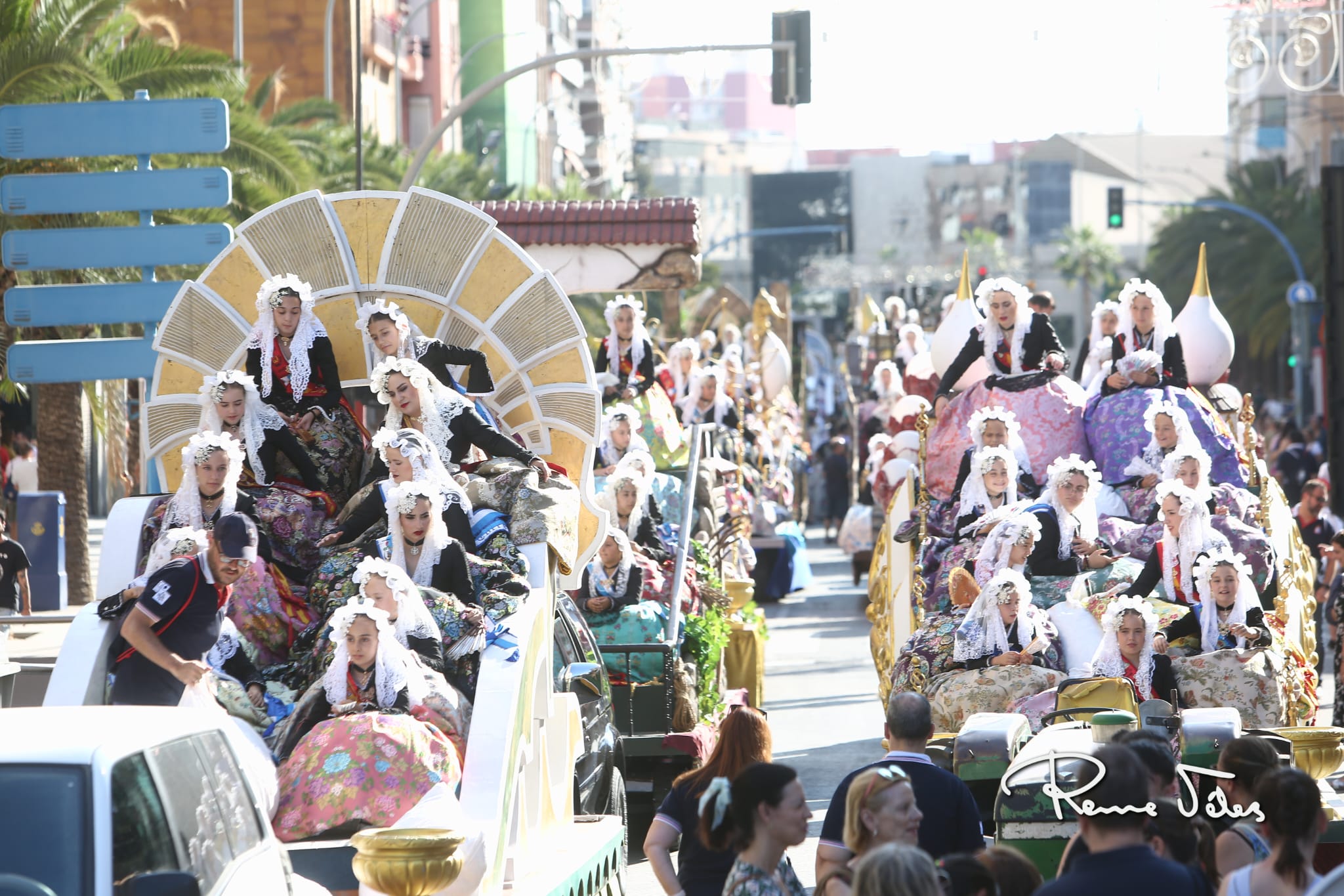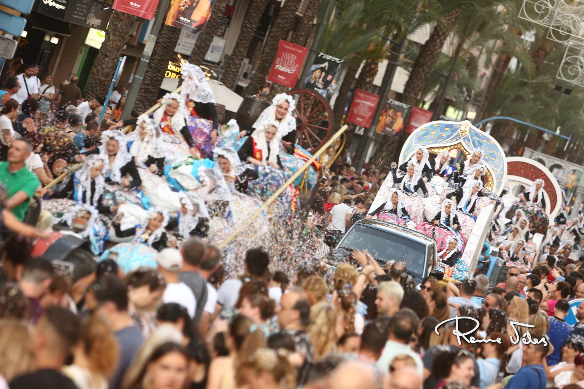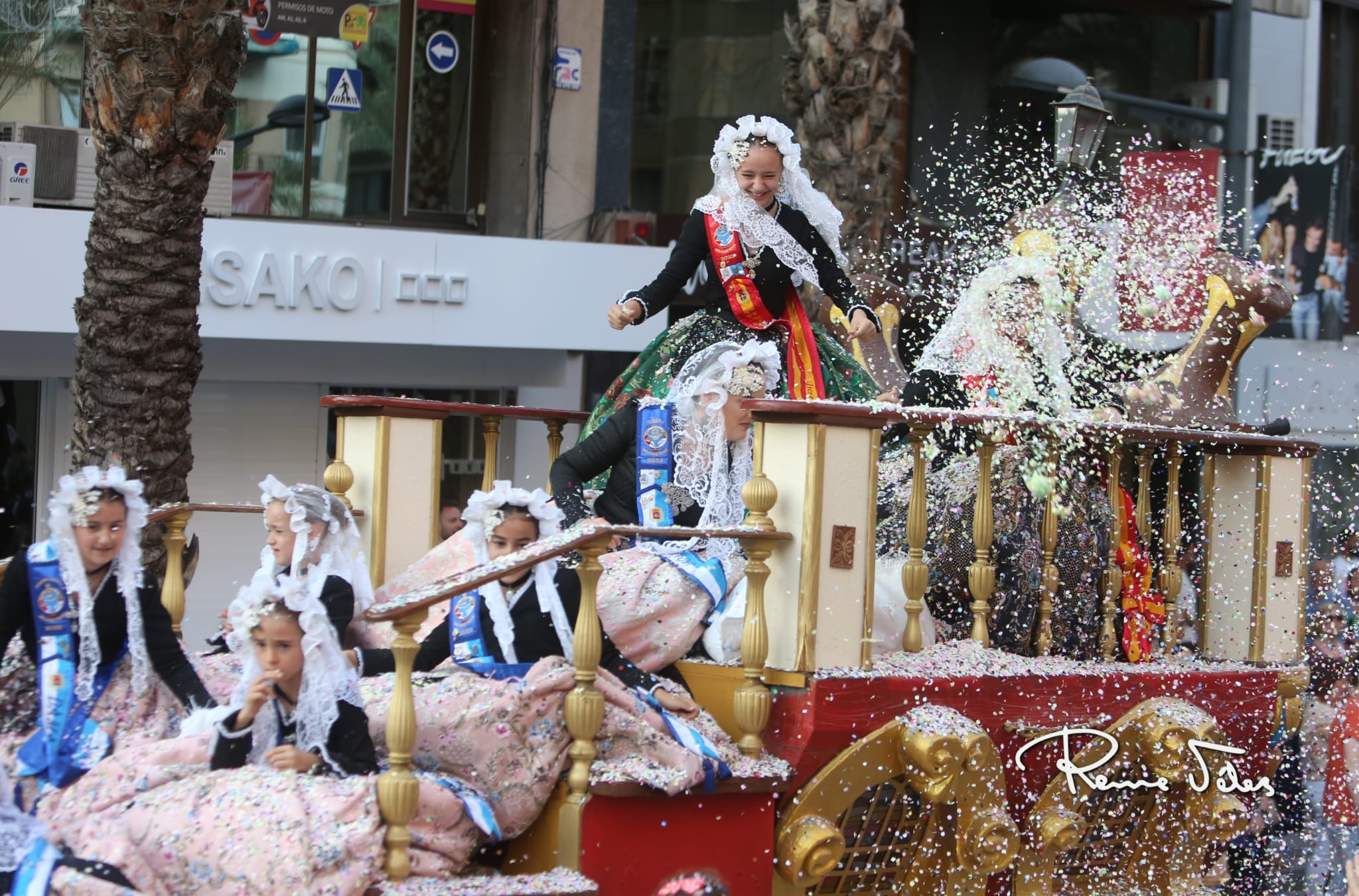Más de 2.000 kilos de confeti han volado por Alfonso el Sabio desde las 34 carrozas en las que han desfilado las bellezas y damas adultas e infantiles de las diferentes hogueras y las belleses del foc y sus damas.