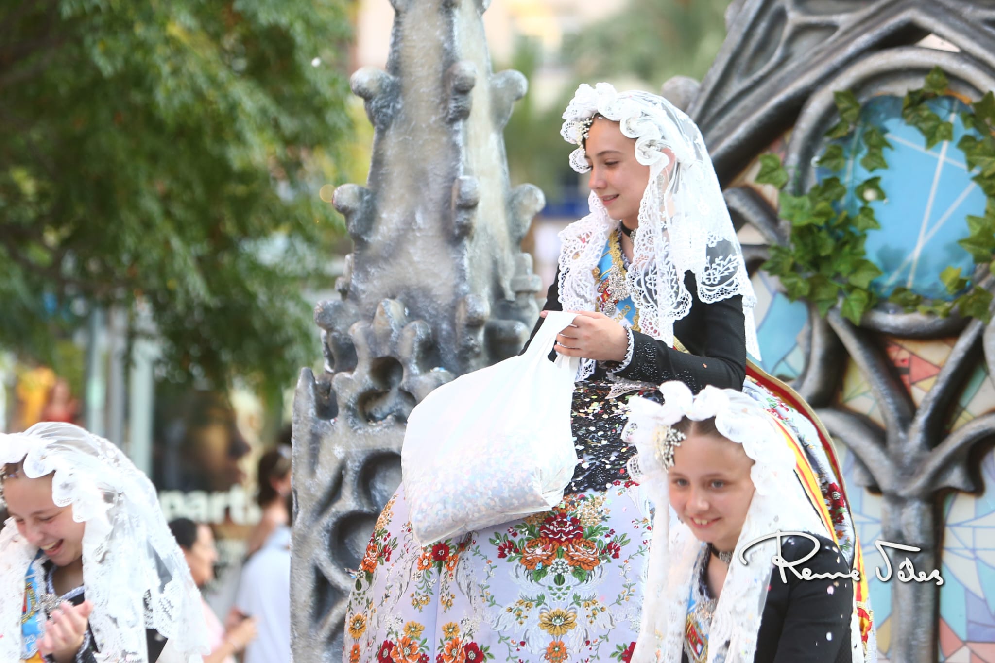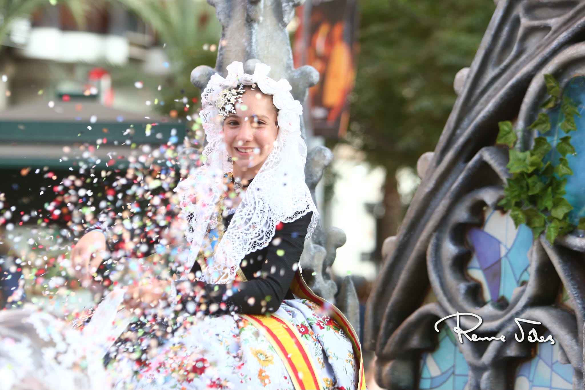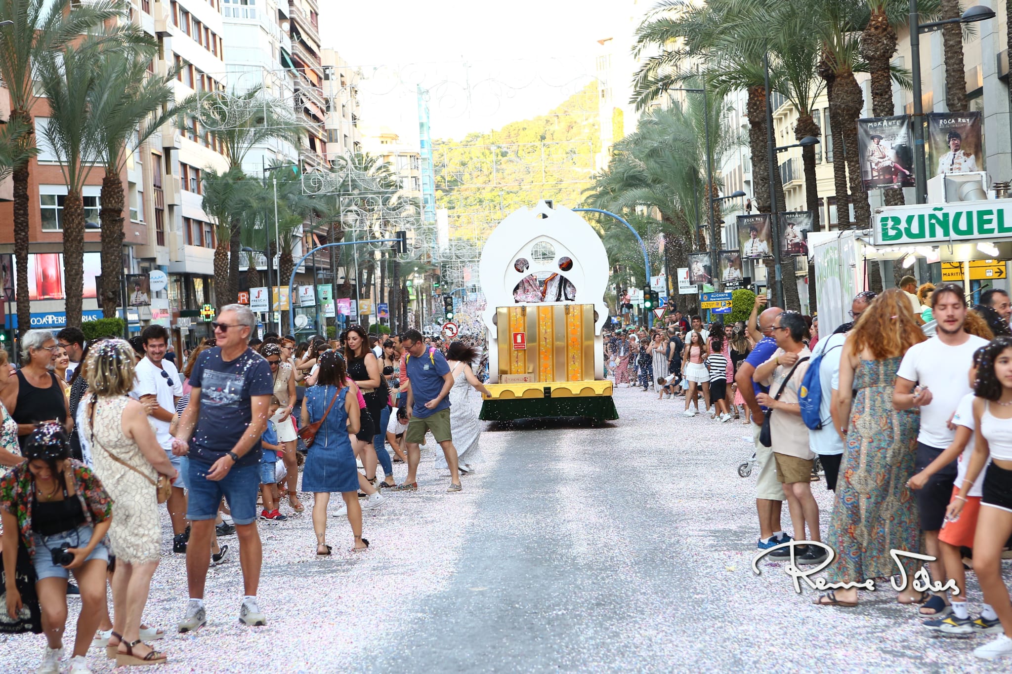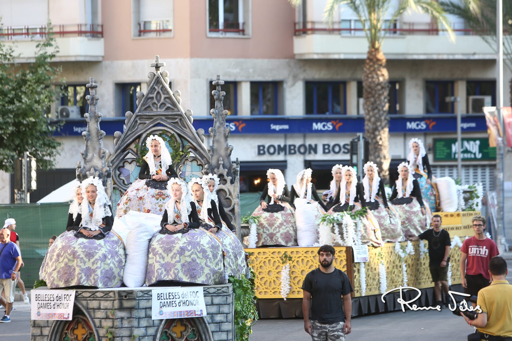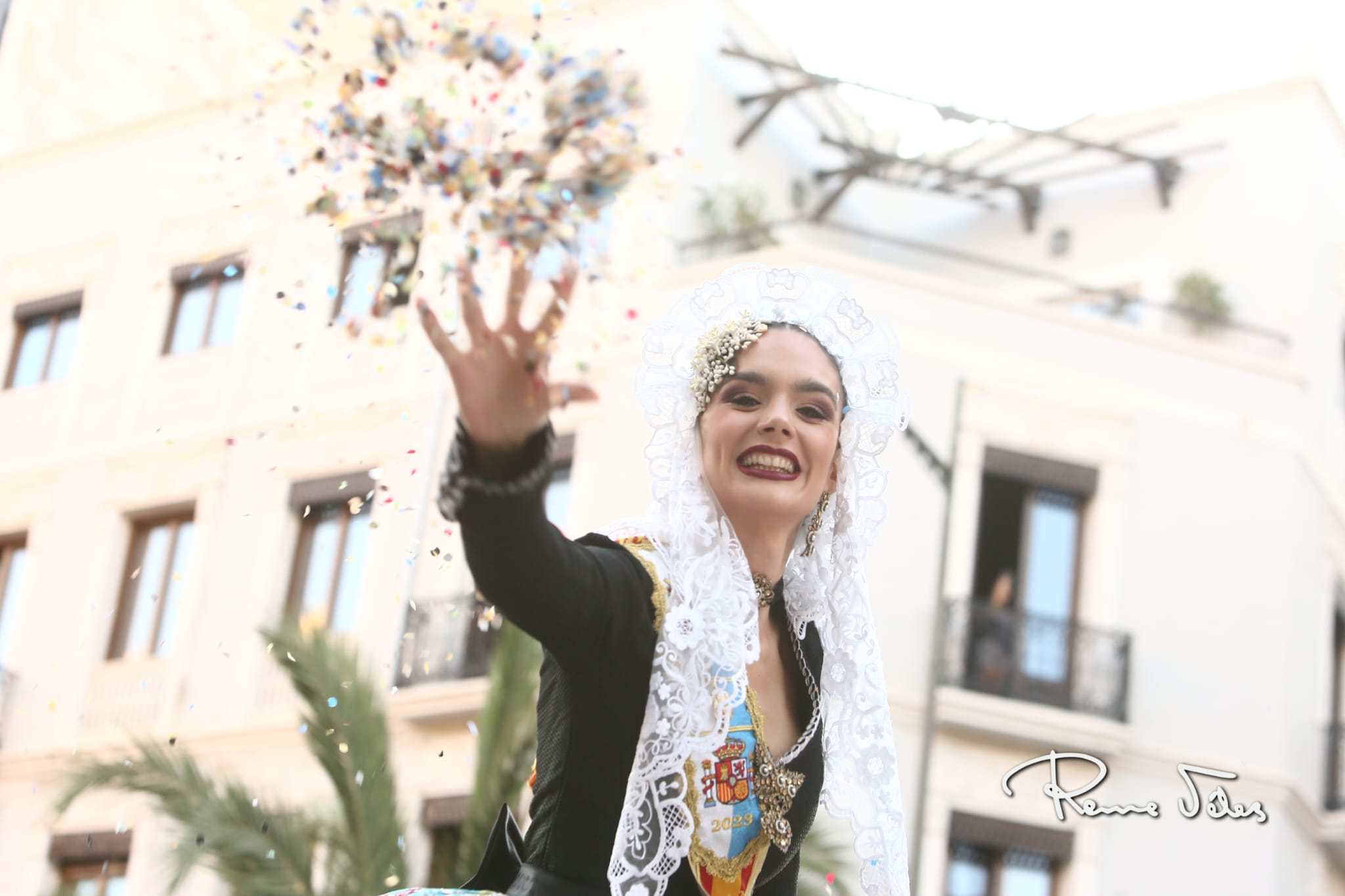 Más de 2.000 kilos de confeti han volado por Alfonso el Sabio desde las 34 carrozas en las que han desfilado las bellezas y damas adultas e infantiles de las diferentes hogueras y las belleses del foc y sus damas.