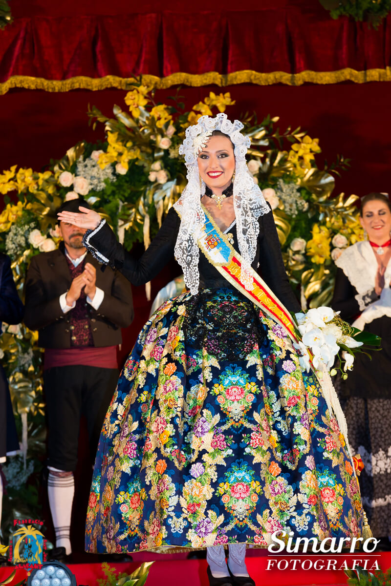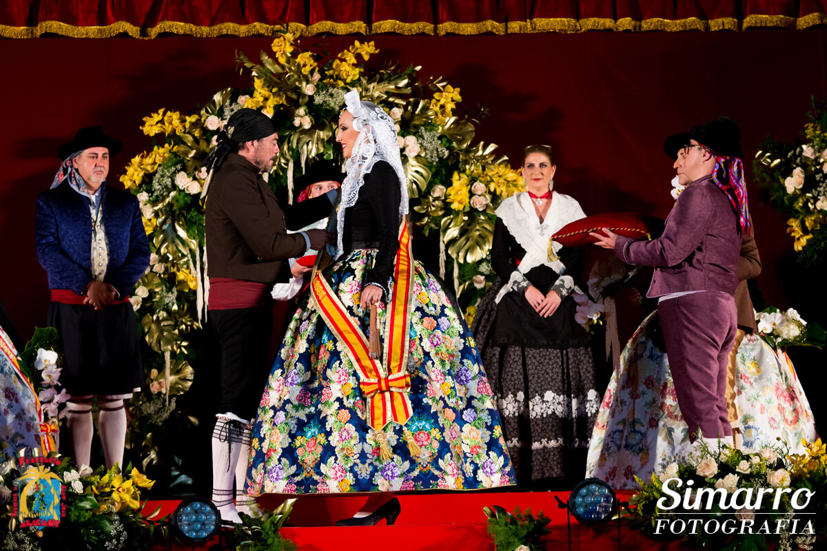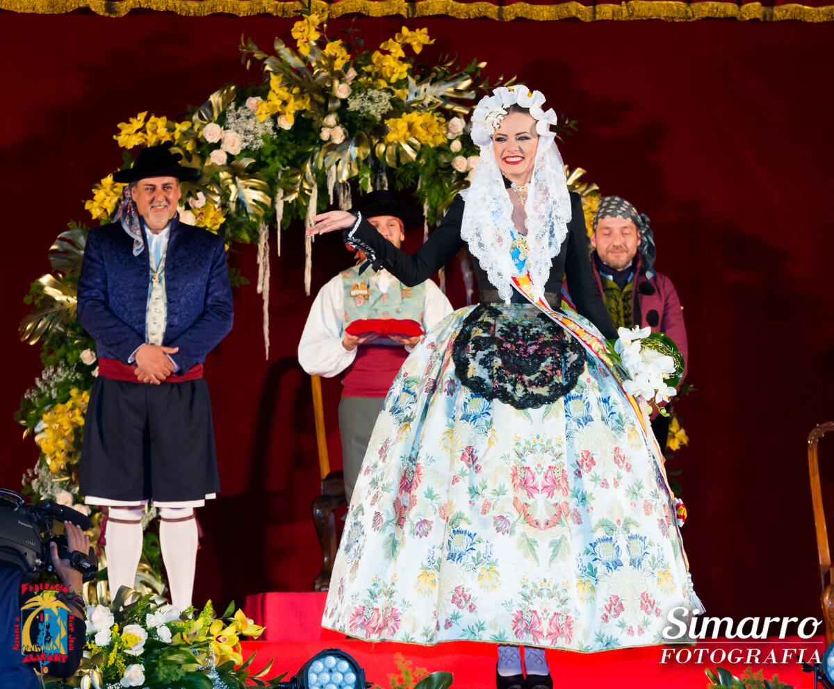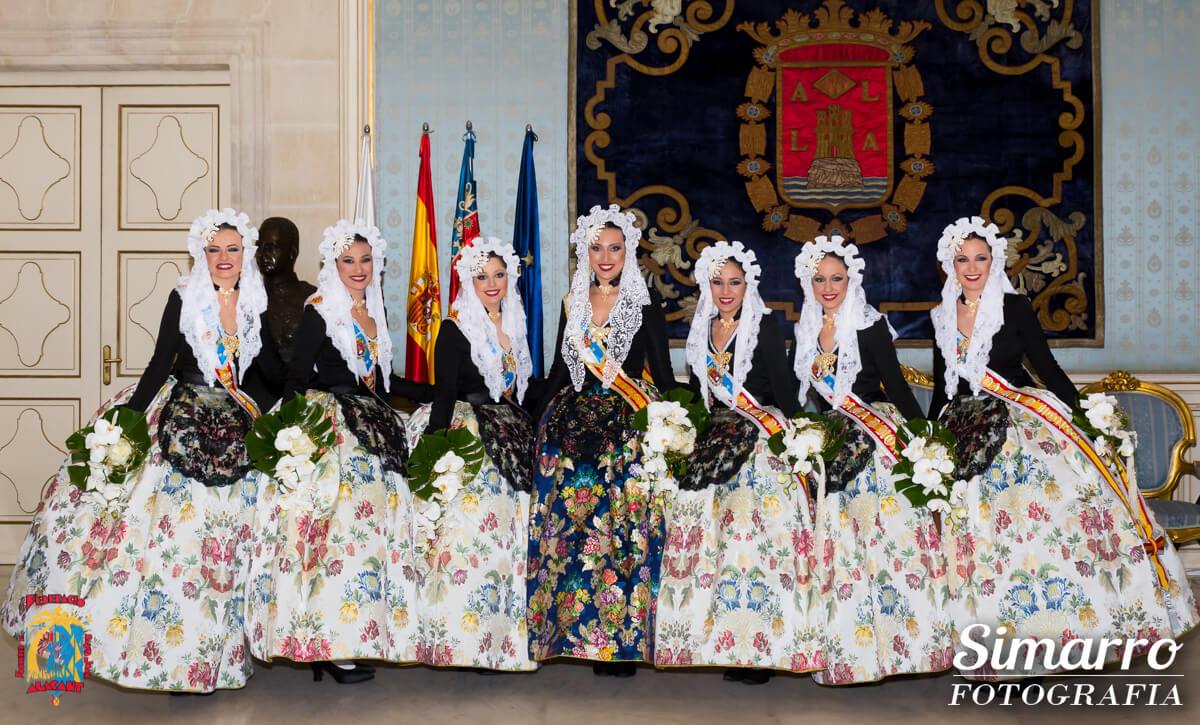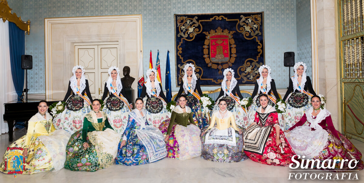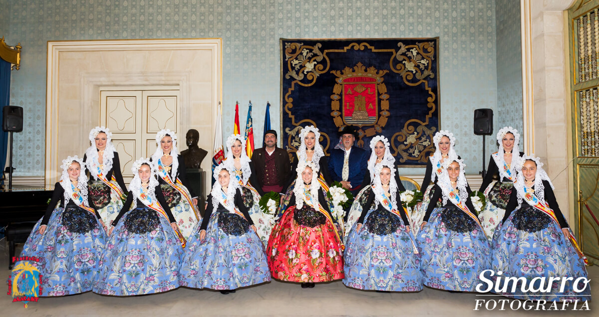 Miguel Ramos fue el responsable de confeccionar los trajes oficiales de novia alicantina de las nuevas representantes. Uno de los momentos más esperados de la noche fue conocer el color de la falda oficial de Aleida; Vives i Marí ha sido la responsable de elaborar artesanalmente ese espolín en tono azul marino. Las damas, en cambio, vestían faldas en fondo blanco.