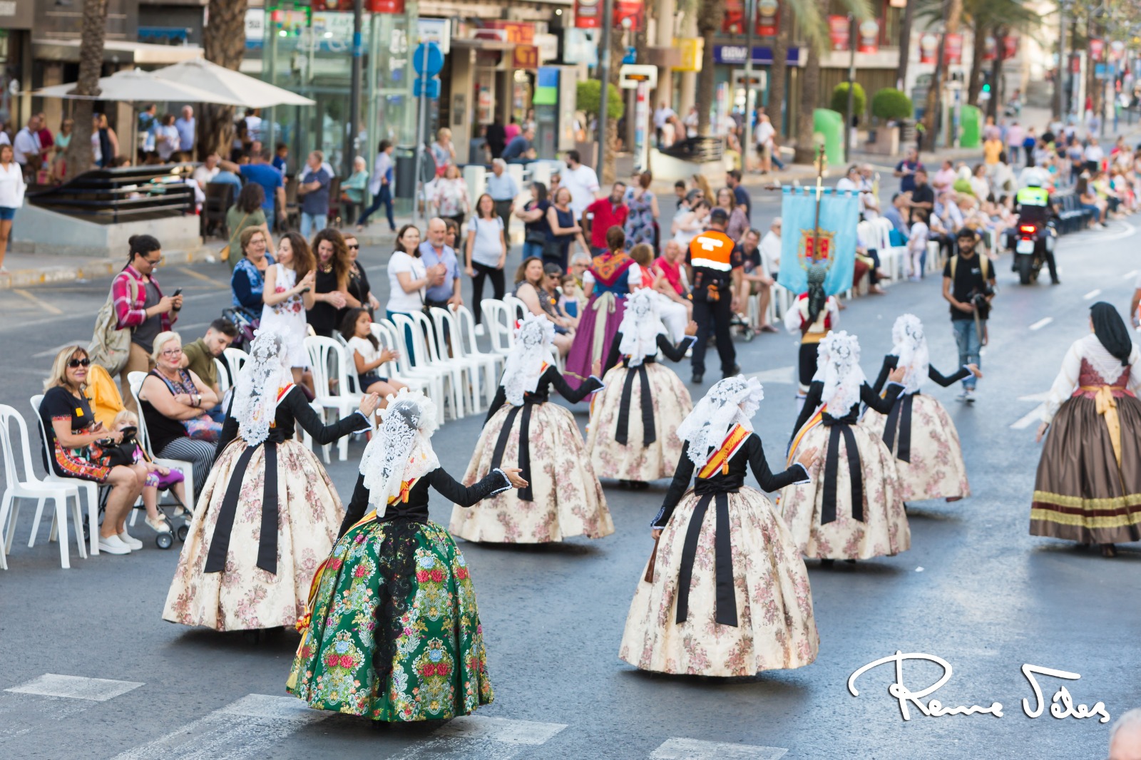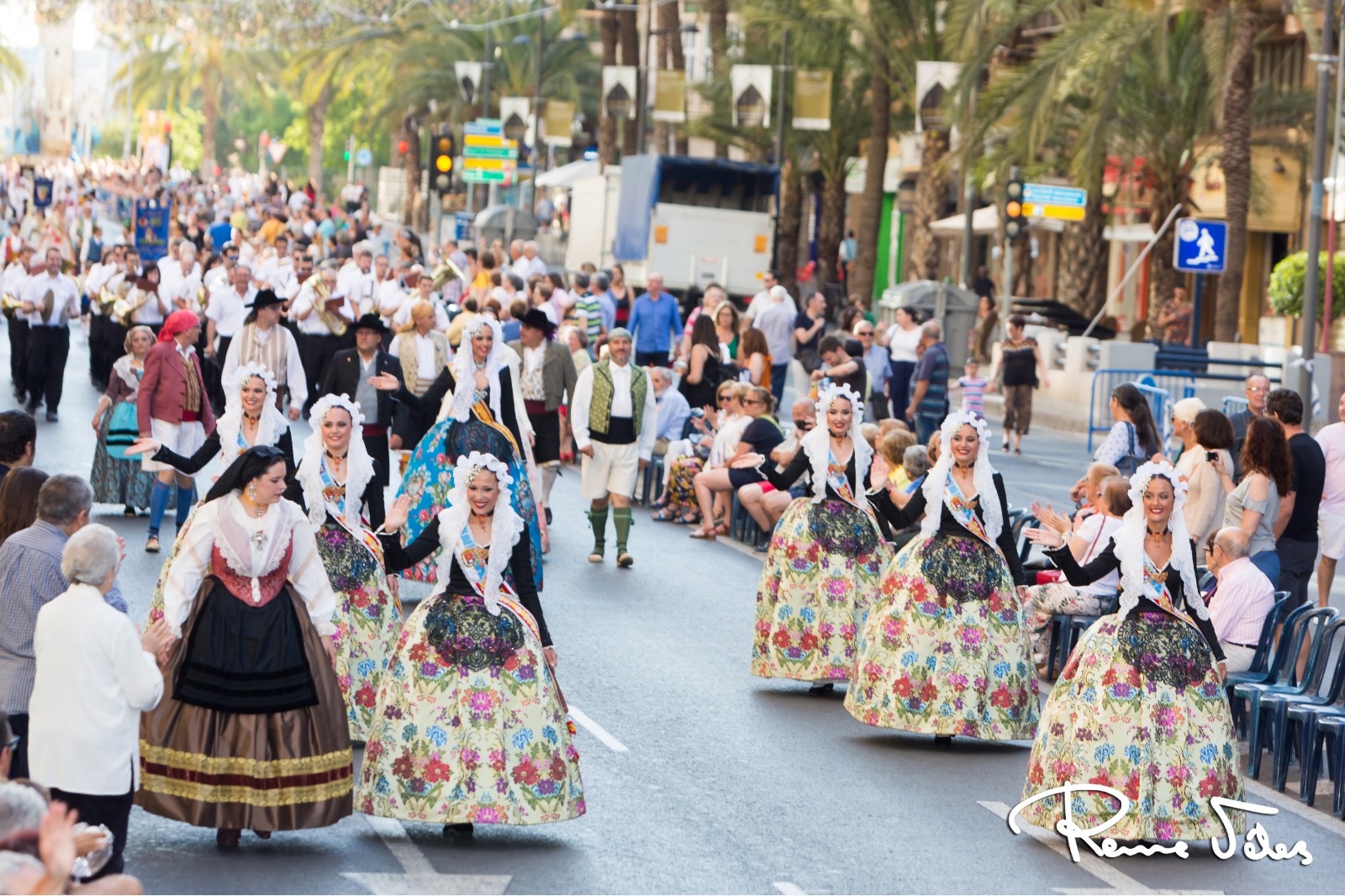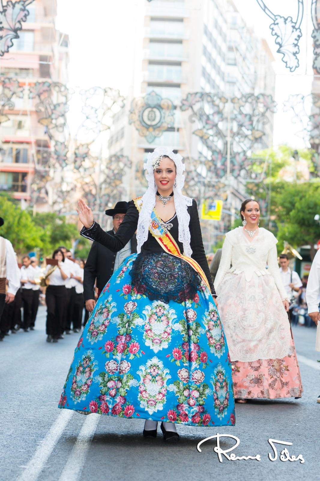Las encargadas de abrir este desfile fueron les belleses del foc d’ Alacant, Isabel Bartual y Noelia Vinal, y sus damesd’honor, acompañadas por miembros de la Federació de Fogueres y el concejal, José Ramón González.