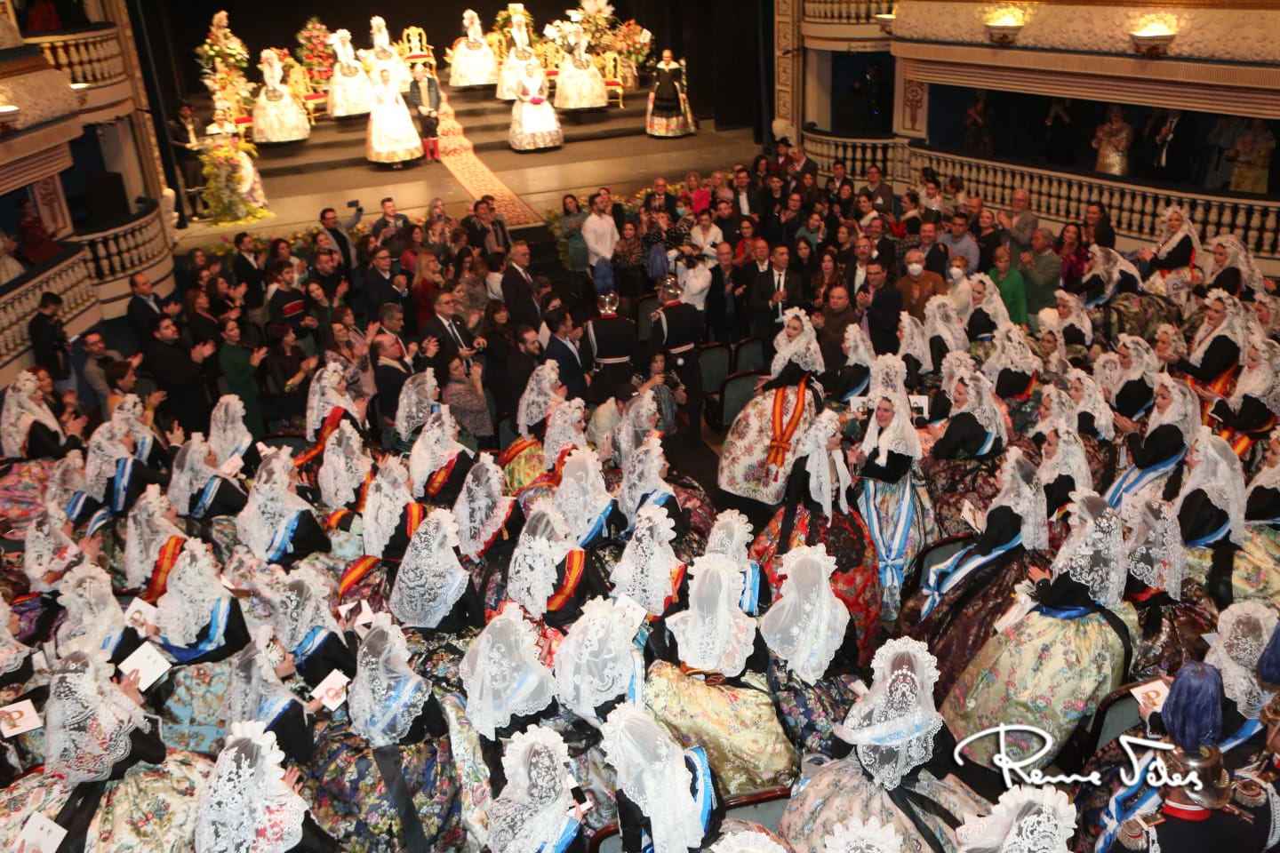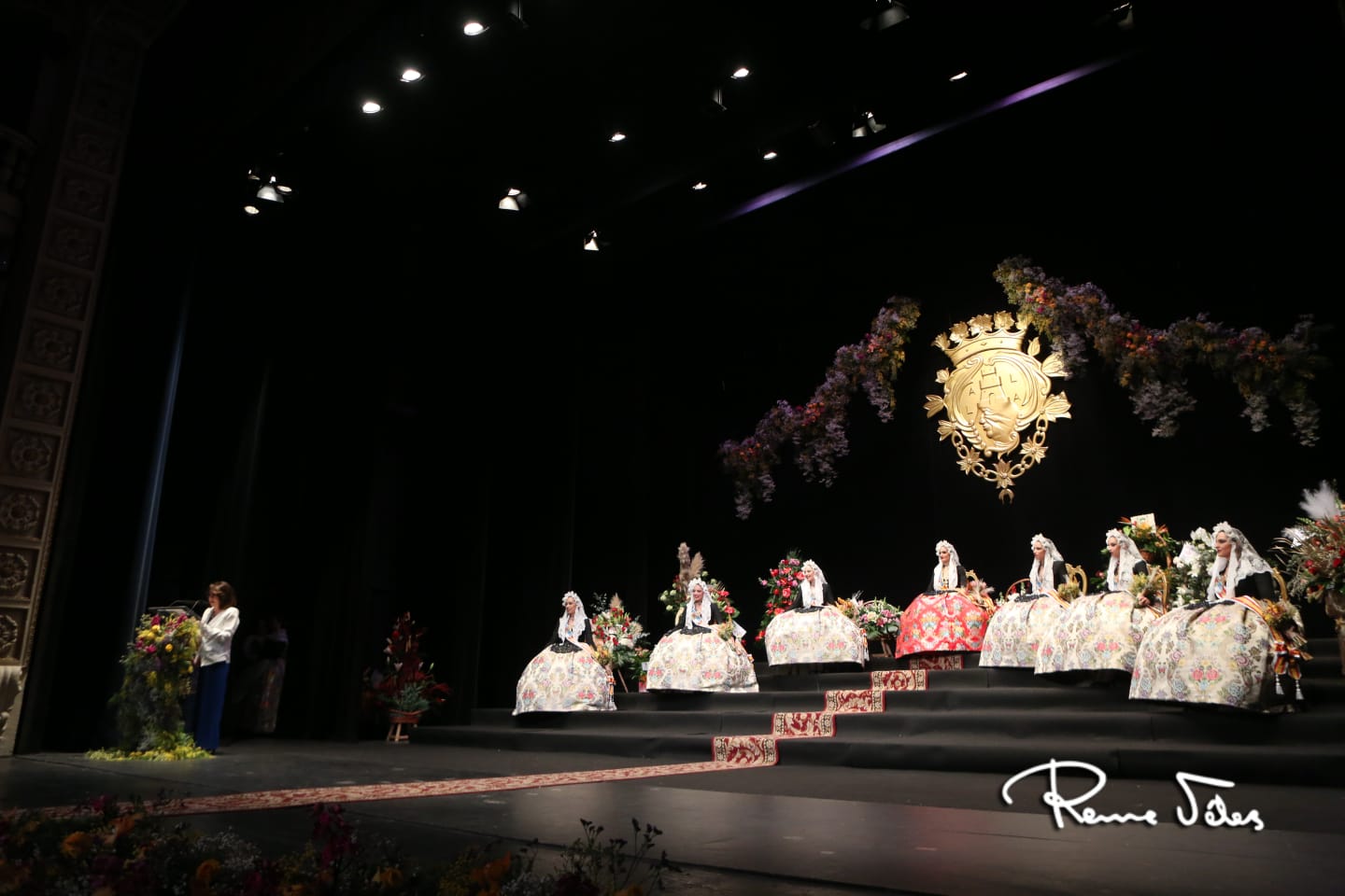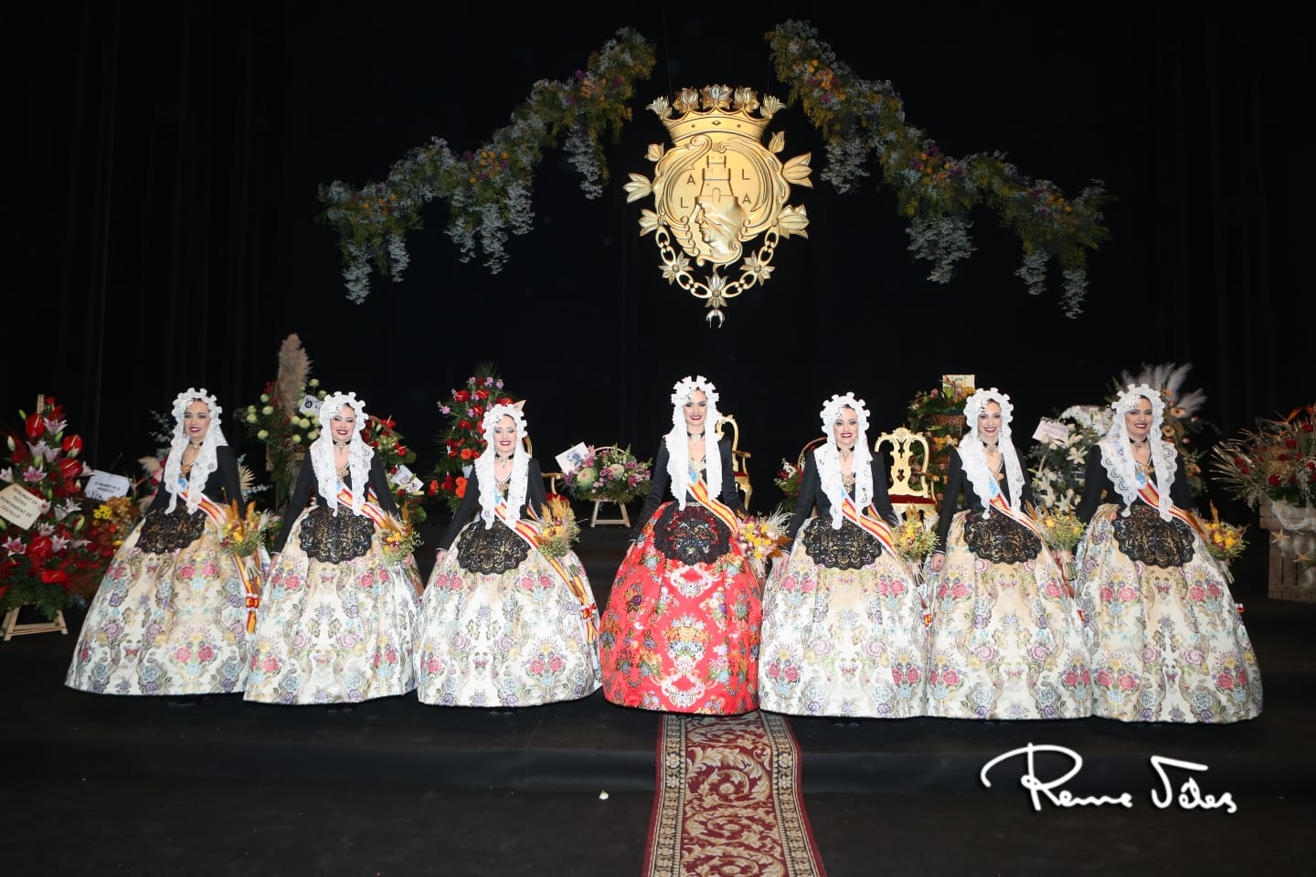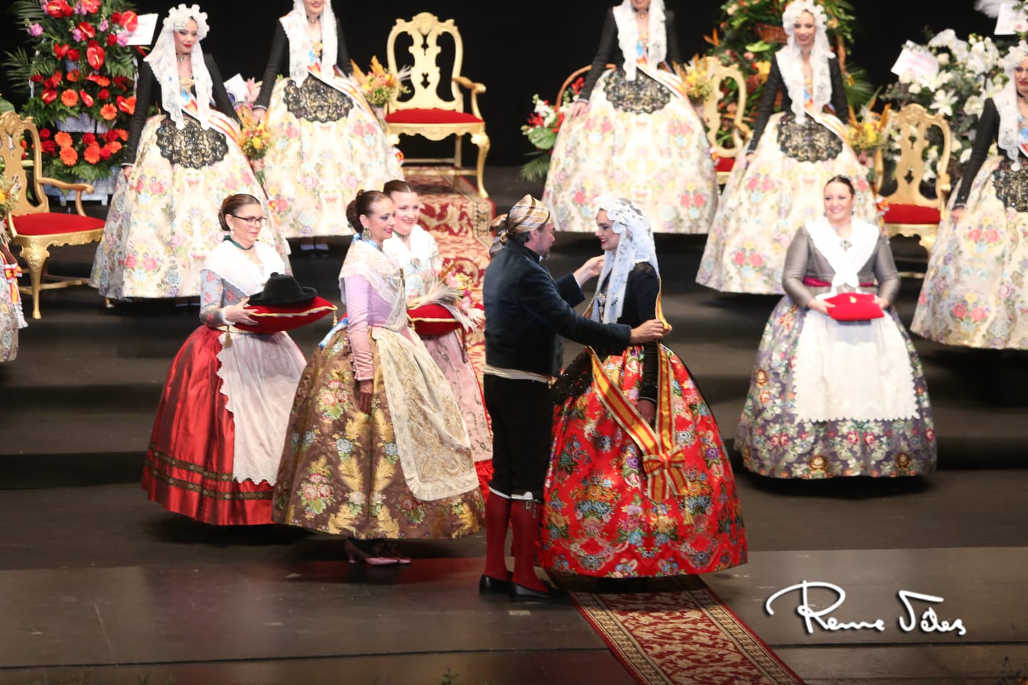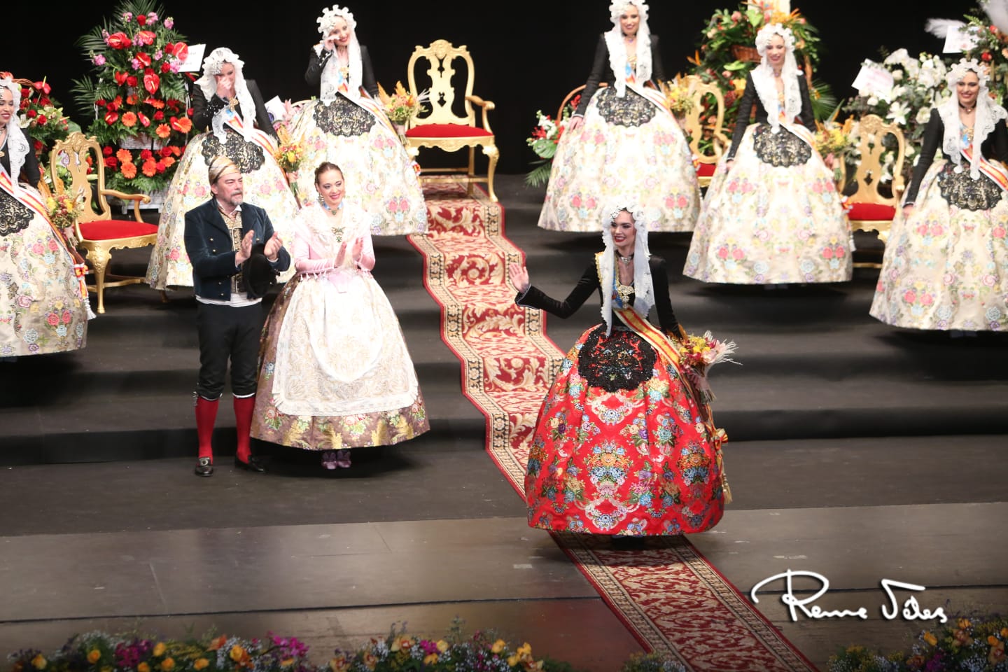 El acto, conducido por María Esquerdo de la foguera Avenida de Loring–Estación y Adrián Domínguez de Bulevard del Pla-Garbinet, ha comenzado con la imposición de bandas a les dames d’honor por parte de la presidenta de la Federació de les Fogueres de Sant Joan, Toñi Martín-Zarco. Las seis representantes han ido apareciendo una a una por los laterales del escenario ataviadas con sus trajes oficiales, con falda de seda en color pruna, donde les han acompañado familiares y amigos portando sus bandas y ramos de flores.