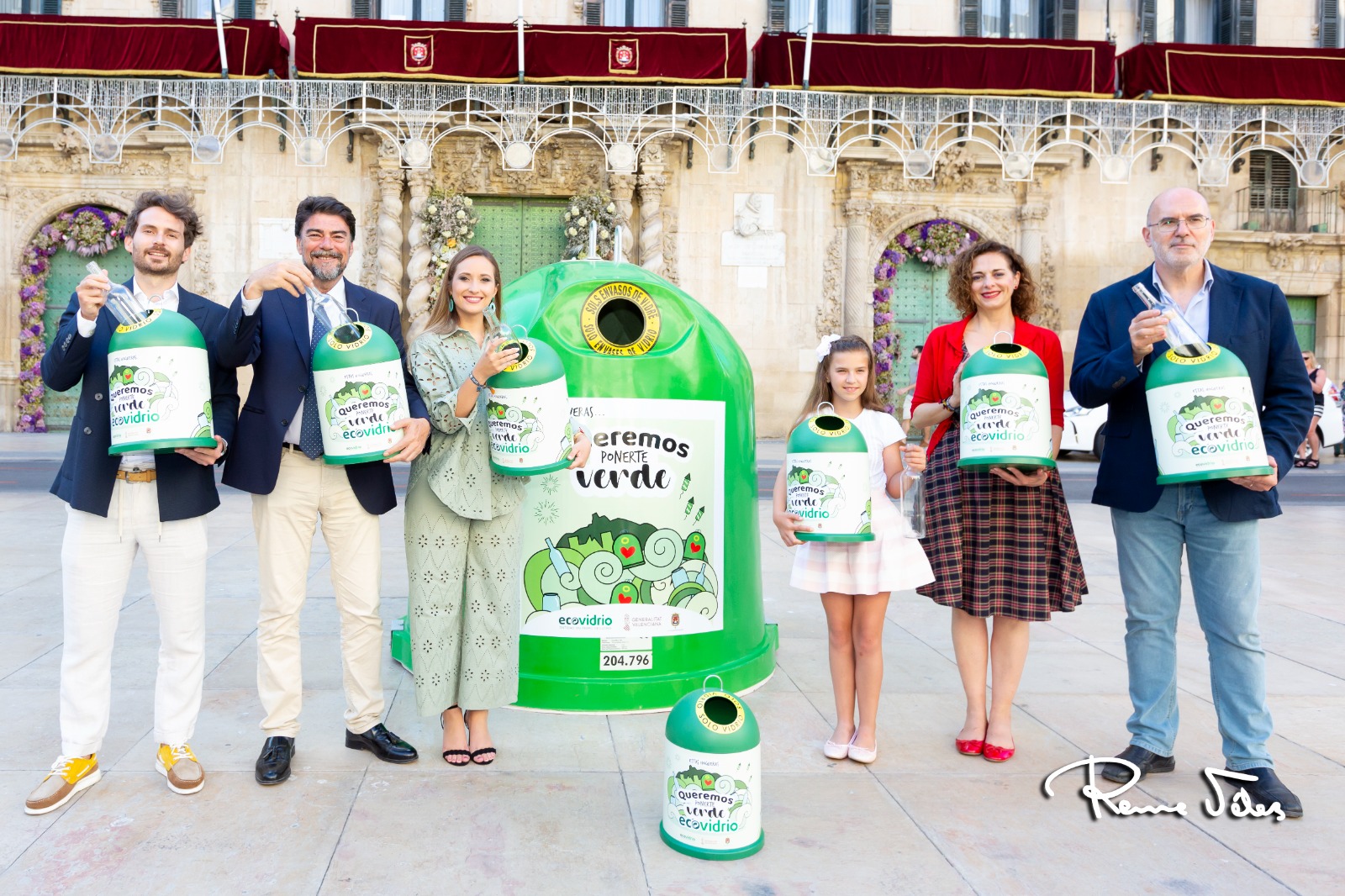 Al acto de presentación de la campaña, que tuvo lugar ayer en la Plaza del Ayuntamiento, asistieron el coordinador de Comunicación Corporativa de Ecovidrio, Julio Tinaquero; el alcalde de Alicante, Luis Barcala; el concejal de Medio Ambiente alicantino, Manuel Villar; la presidenta de la Federació de Fogueres, Toñi Martín-Zarco; la bellesa del foc, Marina Niceto; y la bellesa del foc infantil, Valeria Gómez.