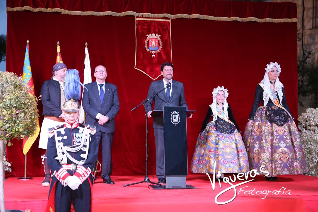 El alcalde de Alicante, Luis Barcala, ha presidido, junto a la Corporación Municipal, este acto al que también han asistido los presidentes de las comisiones, les belleses del foc d’Alacant y sus dames d’honor, miembros de Federació de Fogueres y los jurados.