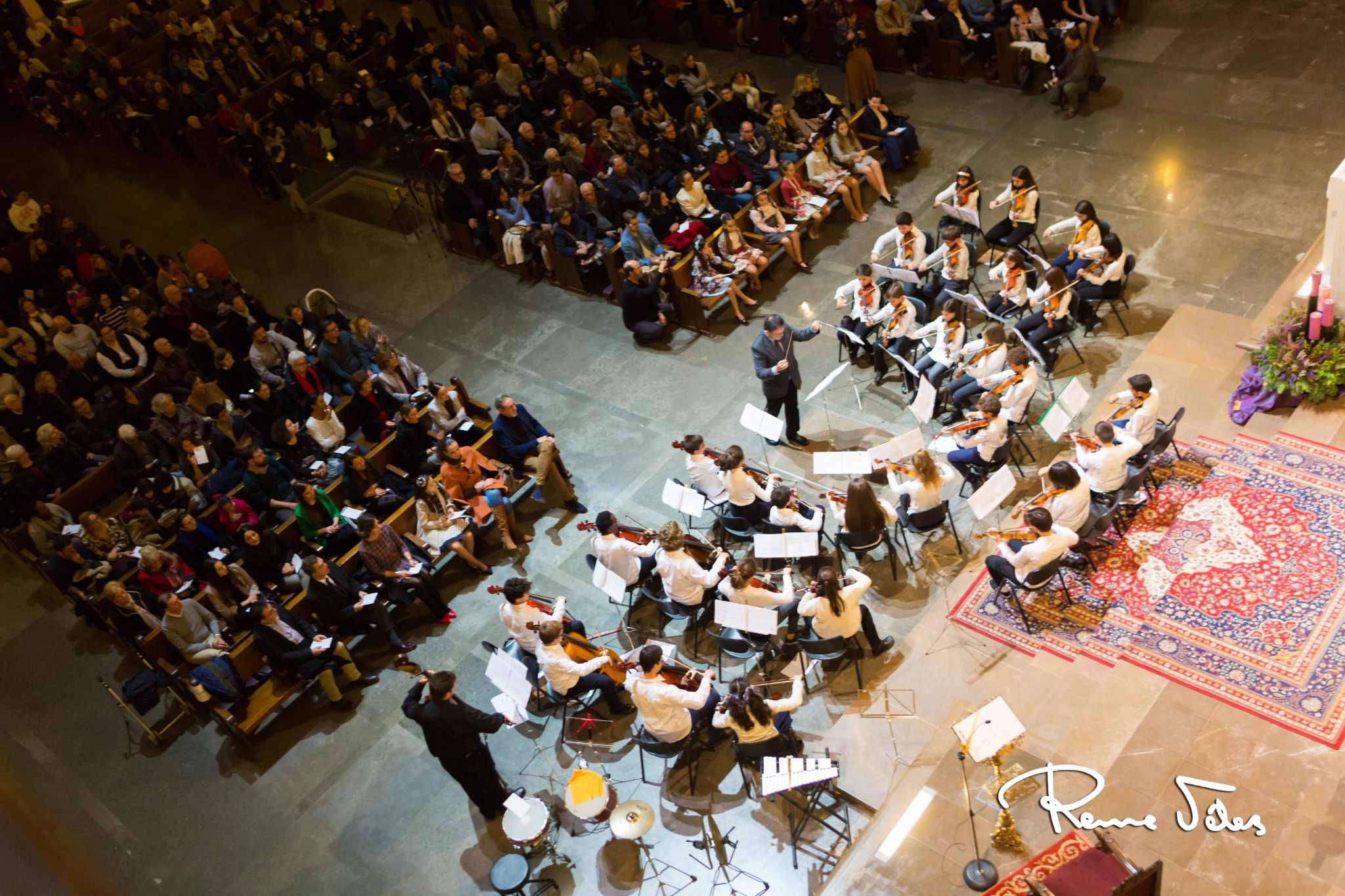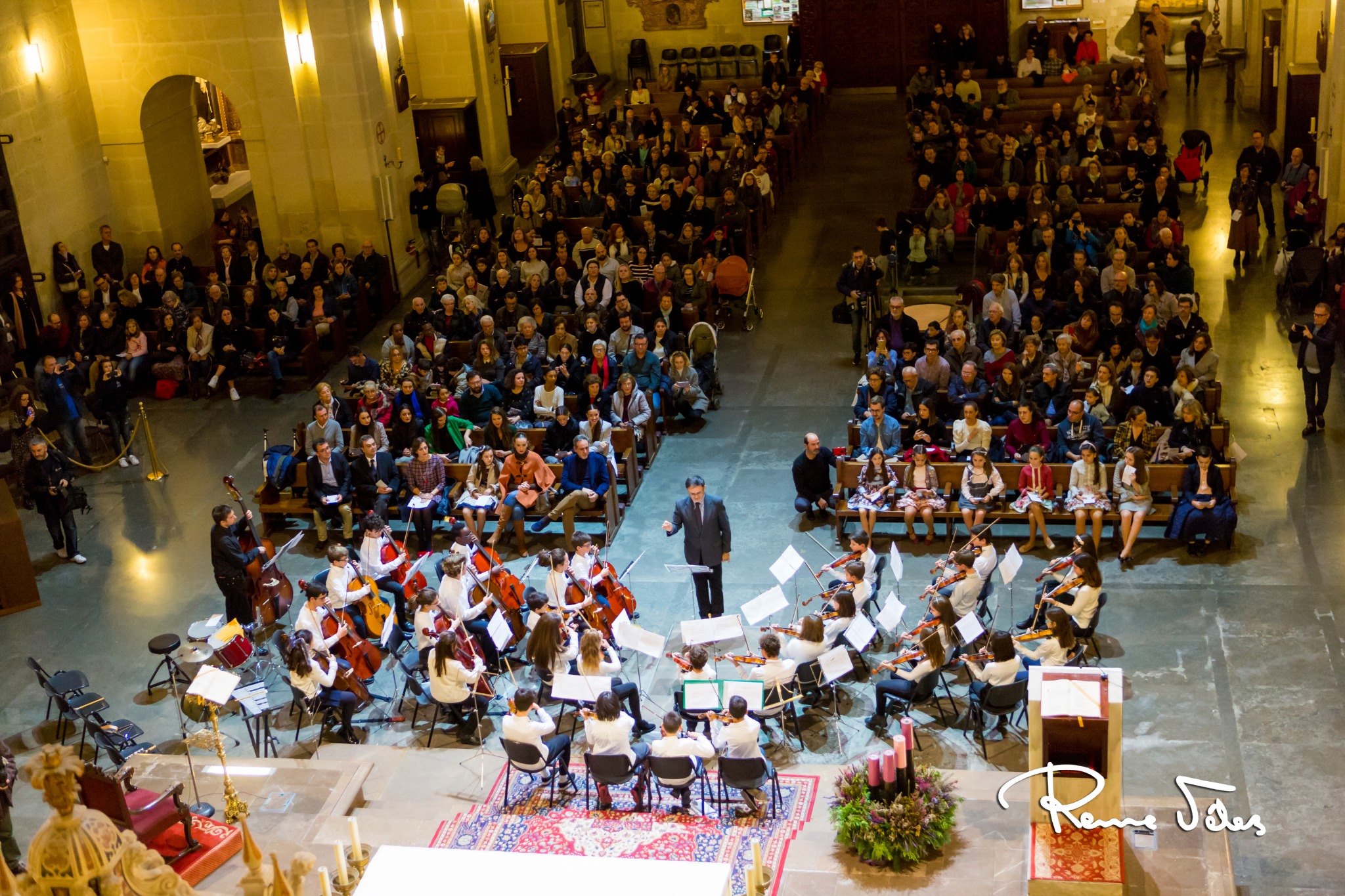 El repertorio de dividió en tres partes. La primera, con grupo instrumental de cuerda, comenzó con la canción popular ‘Plou i fa sol’; seguido por ‘Air de la obertura en Sol M’ de G.P. Telemann; ‘Loure de la obertura en Re M’ de G. P. Telemann; ‘Bourrée de la suite nº2’ de Water Music de Händel, ‘Trio de la sinfonía 54 en sol M’ de Haydn y las canciones populares ‘L’hereu riera’, ‘El rabadà’ y ‘fum, fum, fum’.
