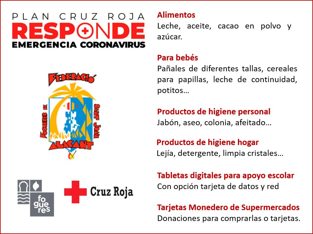 La Federació de Fogueres de Sant Joan se ha unido a Cruz Roja Alicante para promover una campaña solidaria con el objetivo de ayudar y colaborar con las personas más afectadas ante la crisis de la COVID-19. La Federació ha realizado un llamamiento a las comisiones de hogueras y barracas para realizar una recogida de alimentos y otros productos.