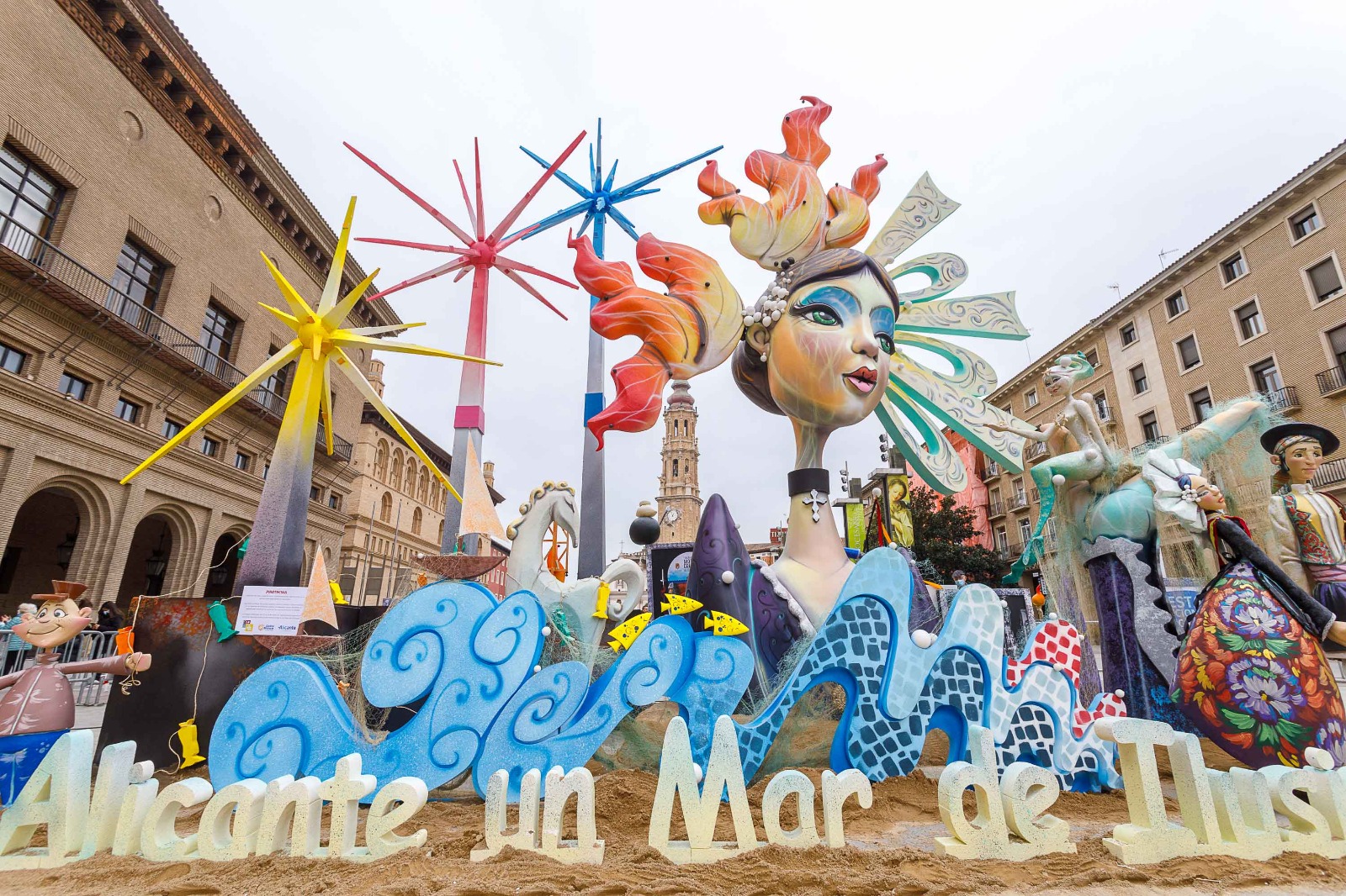 El mejor preludio a la jornada principal, que se celebrará este sábado 26 de marzo, fue anoche la plantà del monumento de la foguera en la plaza del Pilar, que podrá ser disfrutada por zaragozanos y visitantes estos días. Se trata de un conjunto titulado “Alicante, un mar de ilusiones”, que es un homenaje a las fiestas oficiales de la ciudad alicantina y que es obra de Federico Molinero y José Francisco Gómez Fonseca, con un altura de 9 metros y una base de 8×6 metros. El monumento muestra la tradición y la modernidad que caracterizan a Alicante y es una invitación a conocer la ciudad a través de sus fiestas, costumbres y principales atractivos turísticos, por lo que se representa la plaza de los Luceros, como centro neurálgico de la celebración de les Fogueres de Sant Joan, y la playa del Postiguet, donde disfrutar del mar y de los castillos de fuegos en las noches de junio. La foguera incluye otros elementos típicos de las fiestas y tradiciones alicantinas como la música, las marchas de Moros y Cristianos, la Semana Santa, el Carnaval, la isla de Tabarca, la gastronomía o la Romería de la Santa Faz.