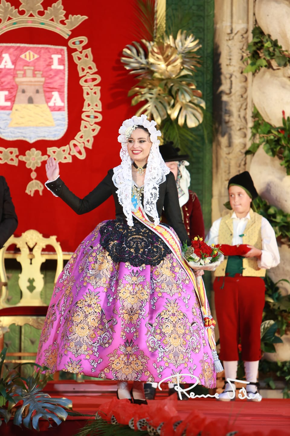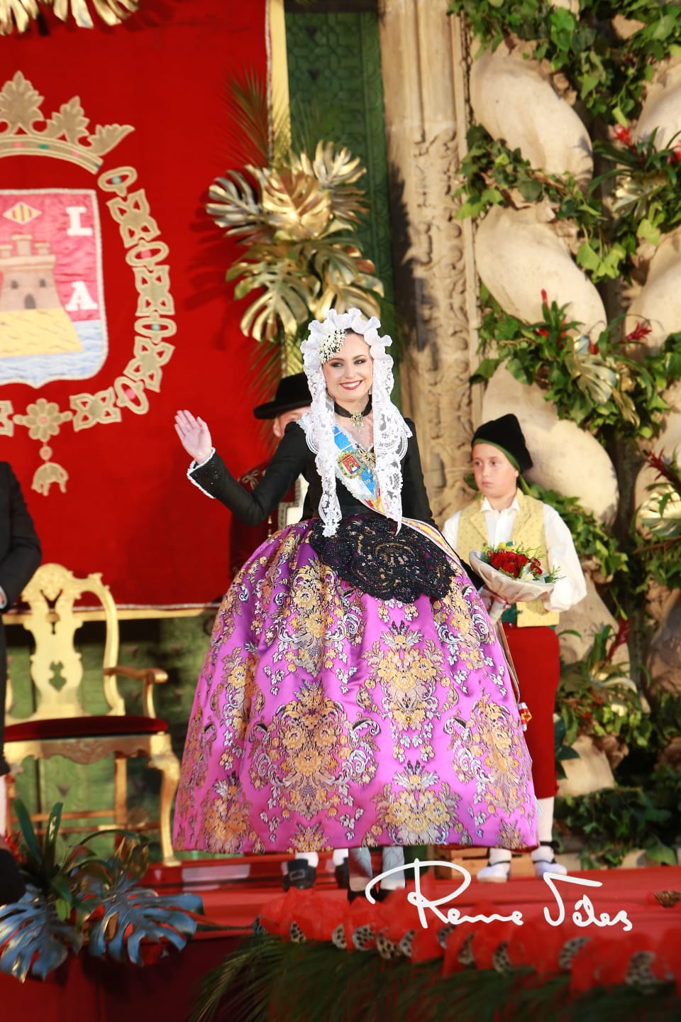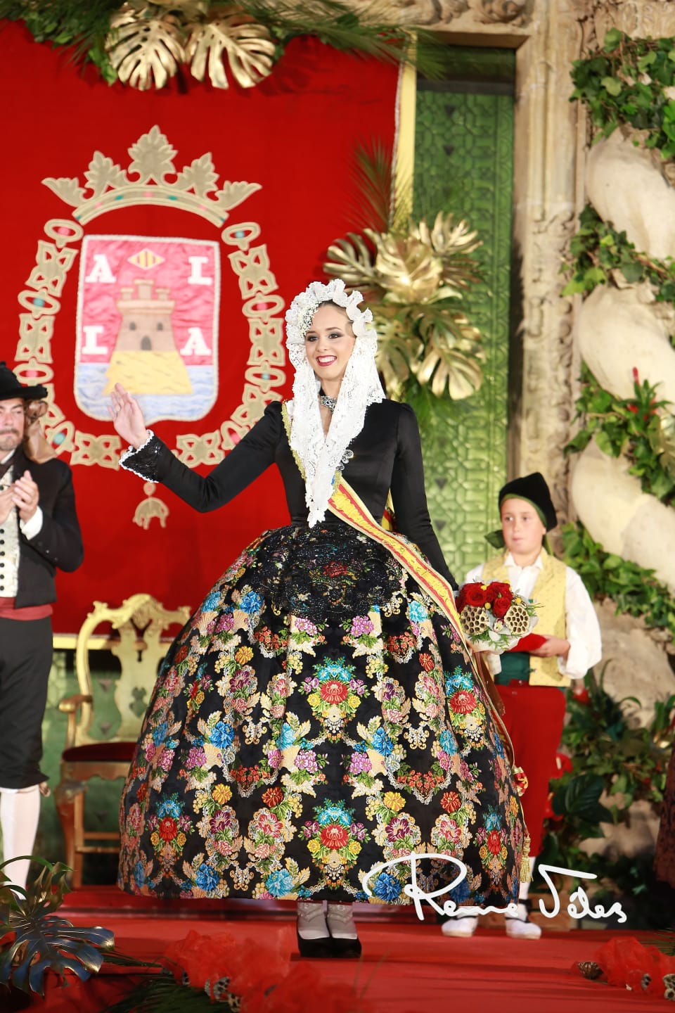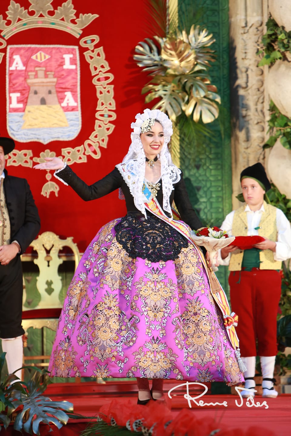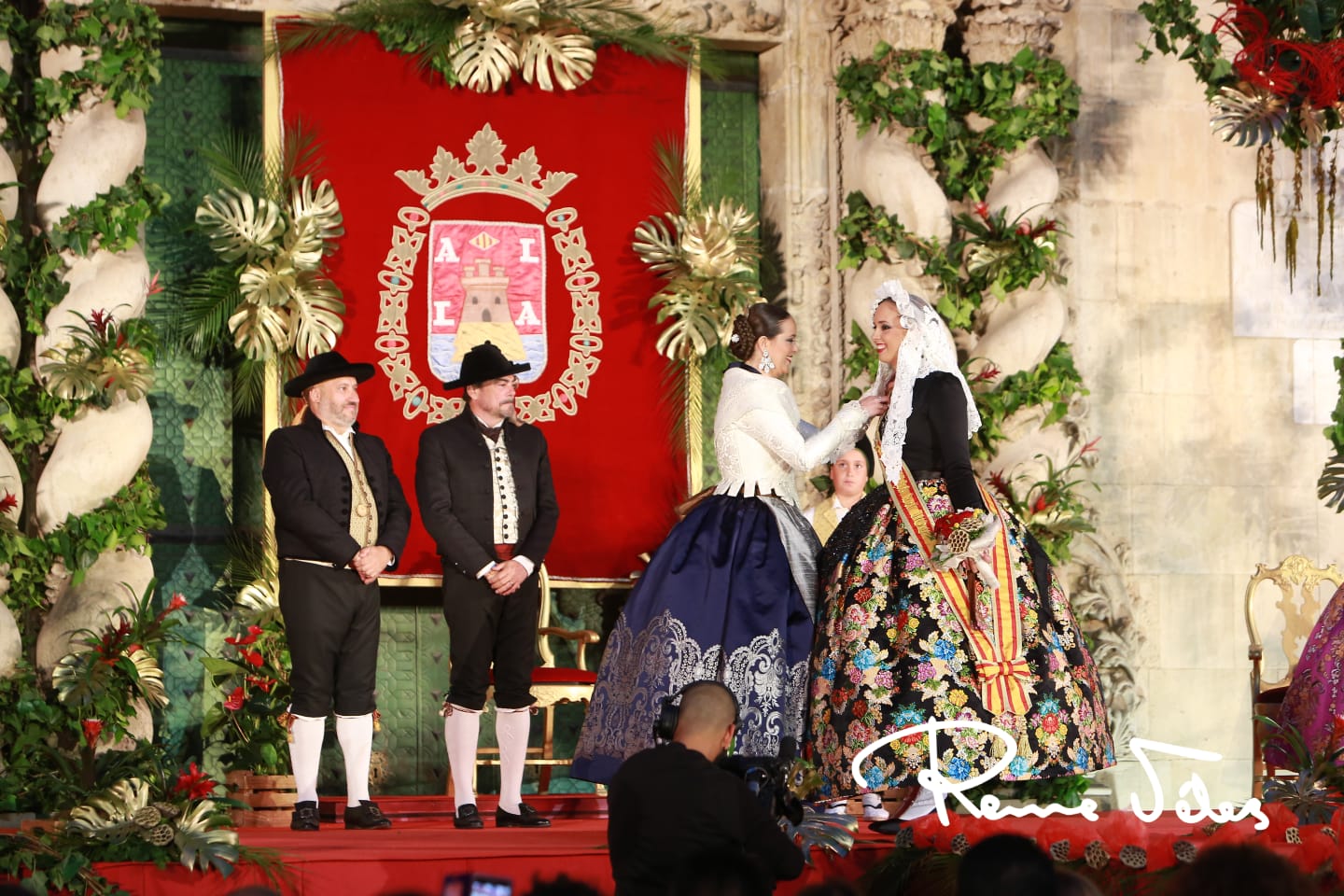 El vicepresidente de la Federació de Fogueres, Manuel García, fue el encargado de imponer las bandas acreditativas a las dames d’honor y el alcalde de la ciudad, Luis Barcala, a Isabel Bartual, quien desveló uno de los secretos mejor guardados como es el color del espolín oficial, modelo Lucentum, en negro azabache y elaborado de manera artesanal por la empresa Vives y Marí.