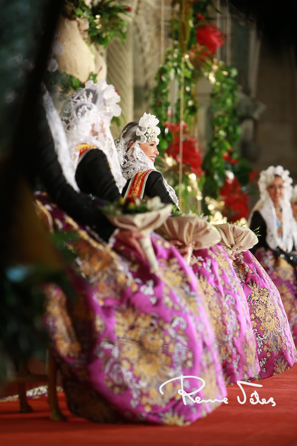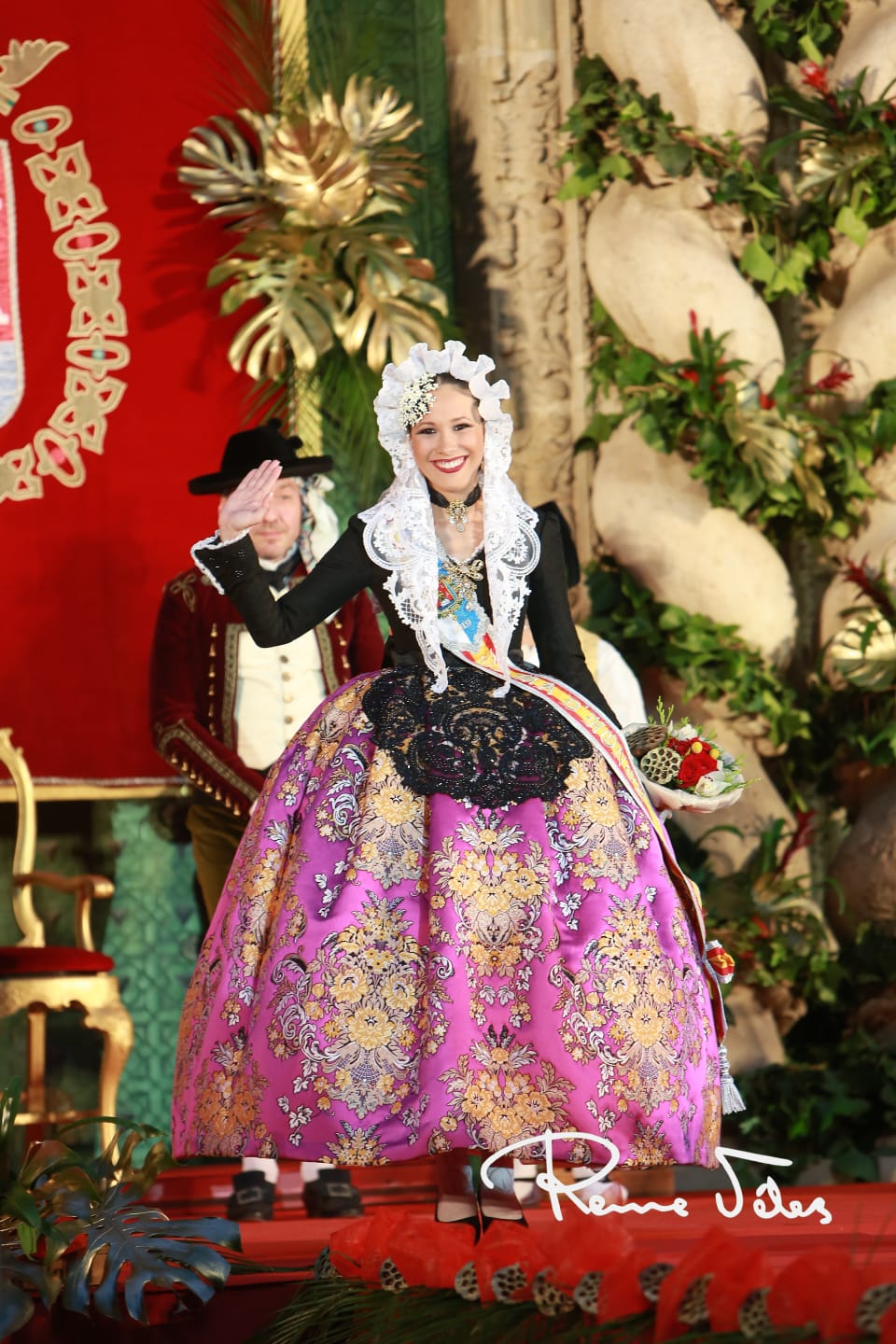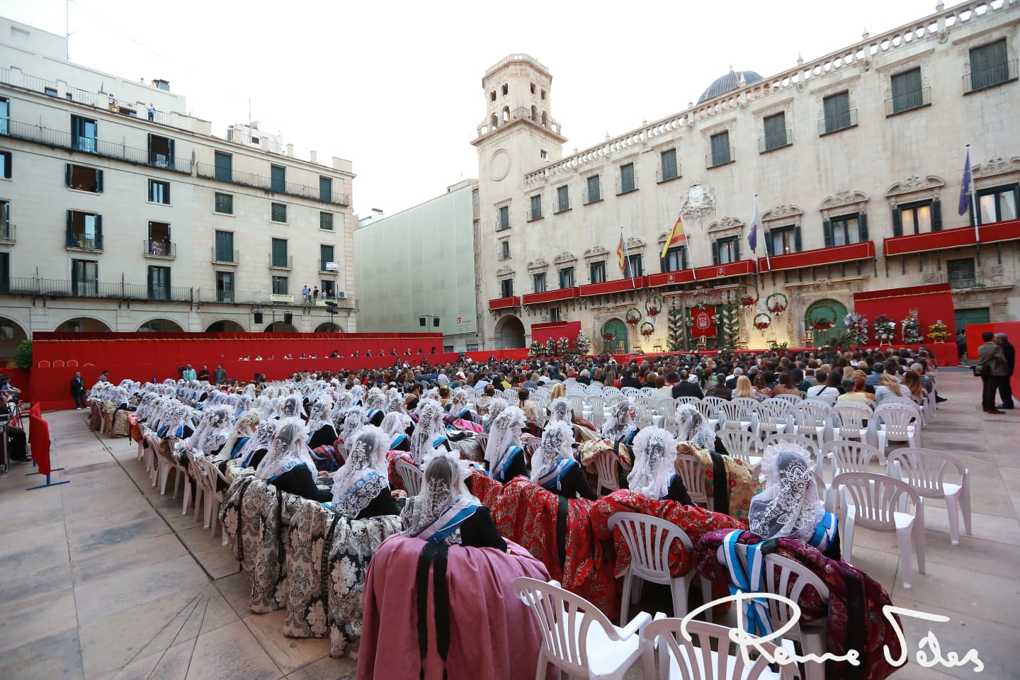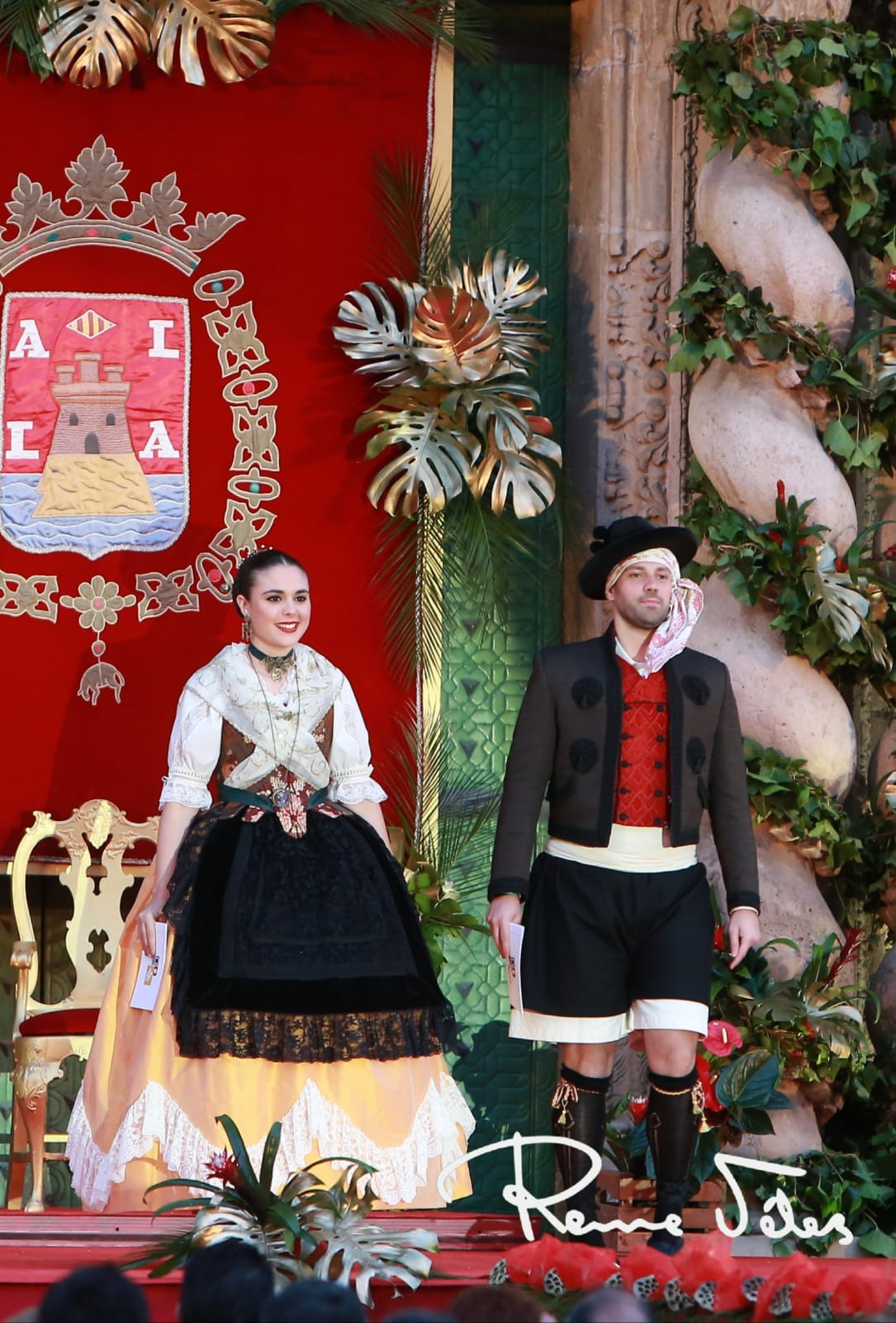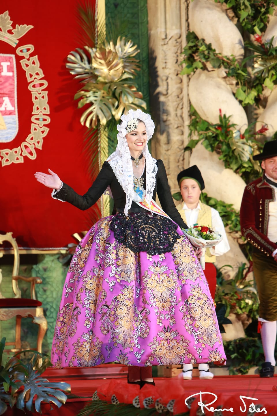 El vicepresidente de la Federació de Fogueres, Manuel García, fue el encargado de imponer las bandas acreditativas a las dames d’honor y el alcalde de la ciudad, Luis Barcala, a Isabel Bartual, quien desveló uno de los secretos mejor guardados como es el color del espolín oficial, modelo Lucentum, en negro azabache y elaborado de manera artesanal por la empresa Vives y Marí.