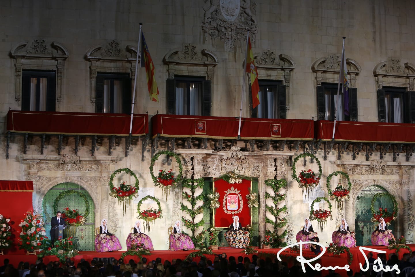 La plaza del Ayuntamiento acogió anoche, sábado, uno de los actos más importantes de calendario fogueril, la proclamación de la bellesa del foc d’Alacant i les seues dames d’honor 2019. Autoridades, foguerers, barraquers y fiestas hermanas se congregaron para ver como Isabal Bartual y sus seis dames d’honor eran oficialmente proclamadas.