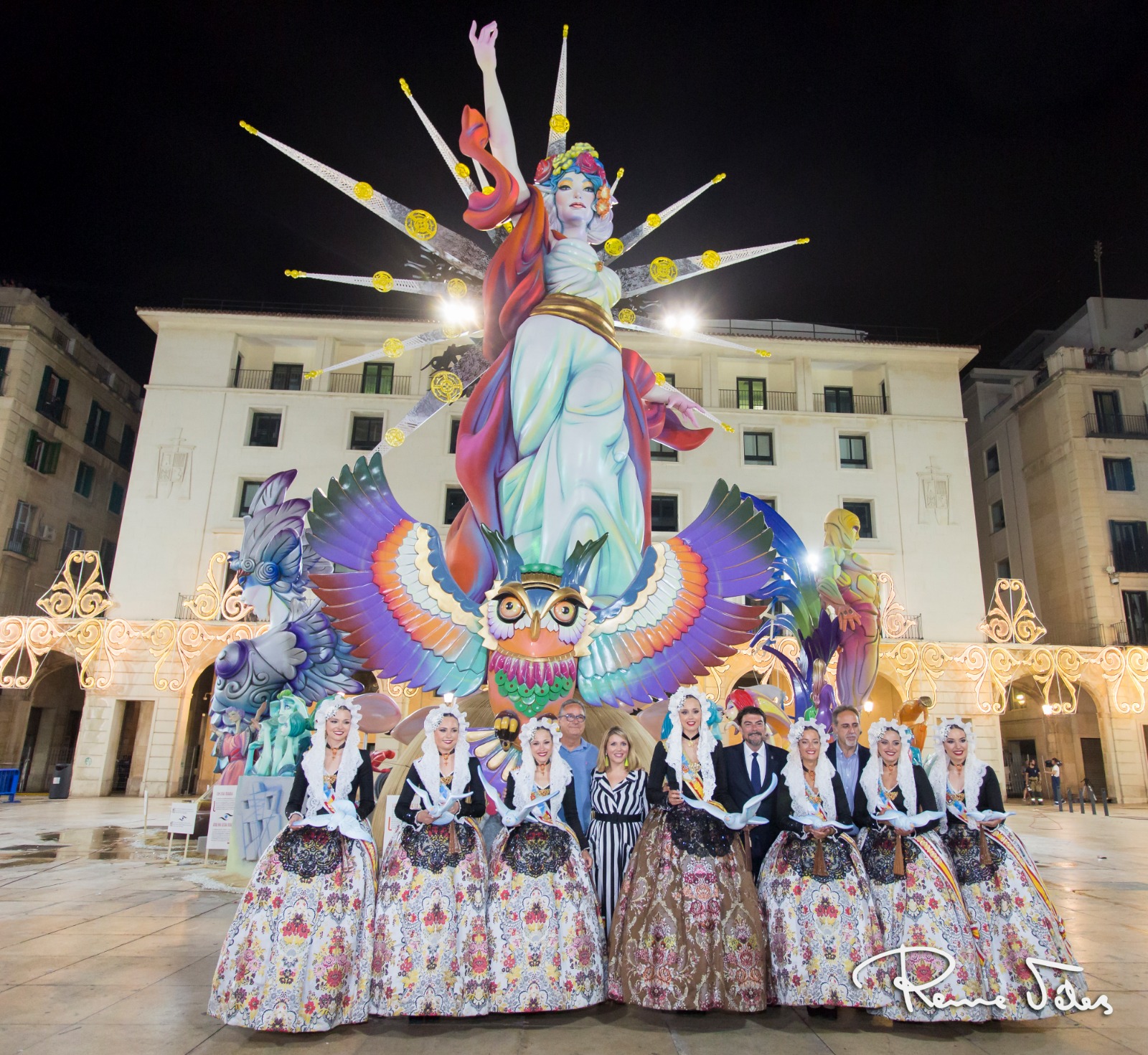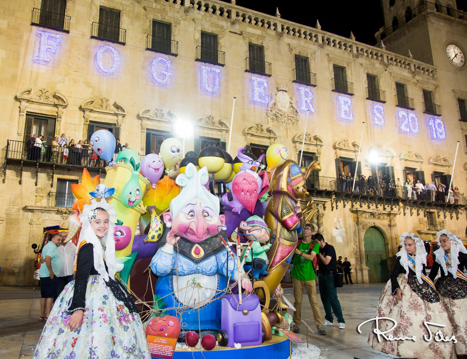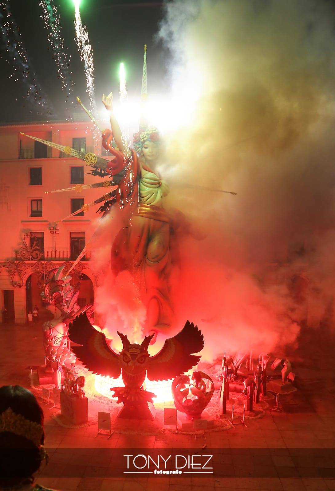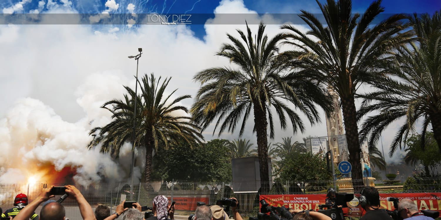 A las 00:00 horas, la monumental Palmera, lanzada desde el castillo de Santa Bárbara por la Pirotecnia Martí daba inicio a la noche más mágica de todas, la Nit de Sant Joan. Primero ardieron los monumentos oficiales, que tras ser consumidas por las llamas dieron paso al resto de hogueras plantadas por toda la ciudad.