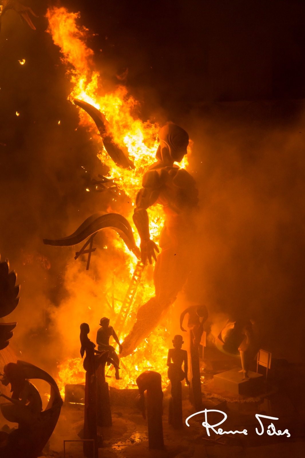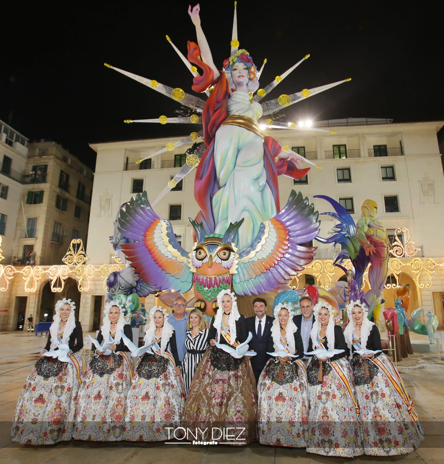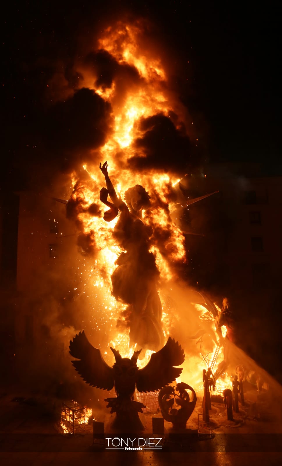 A las 00:00 horas, la monumental Palmera, lanzada desde el castillo de Santa Bárbara por la Pirotecnia Martí daba inicio a la noche más mágica de todas, la Nit de Sant Joan. Primero ardieron los monumentos oficiales, que tras ser consumidas por las llamas dieron paso al resto de hogueras plantadas por toda la ciudad.