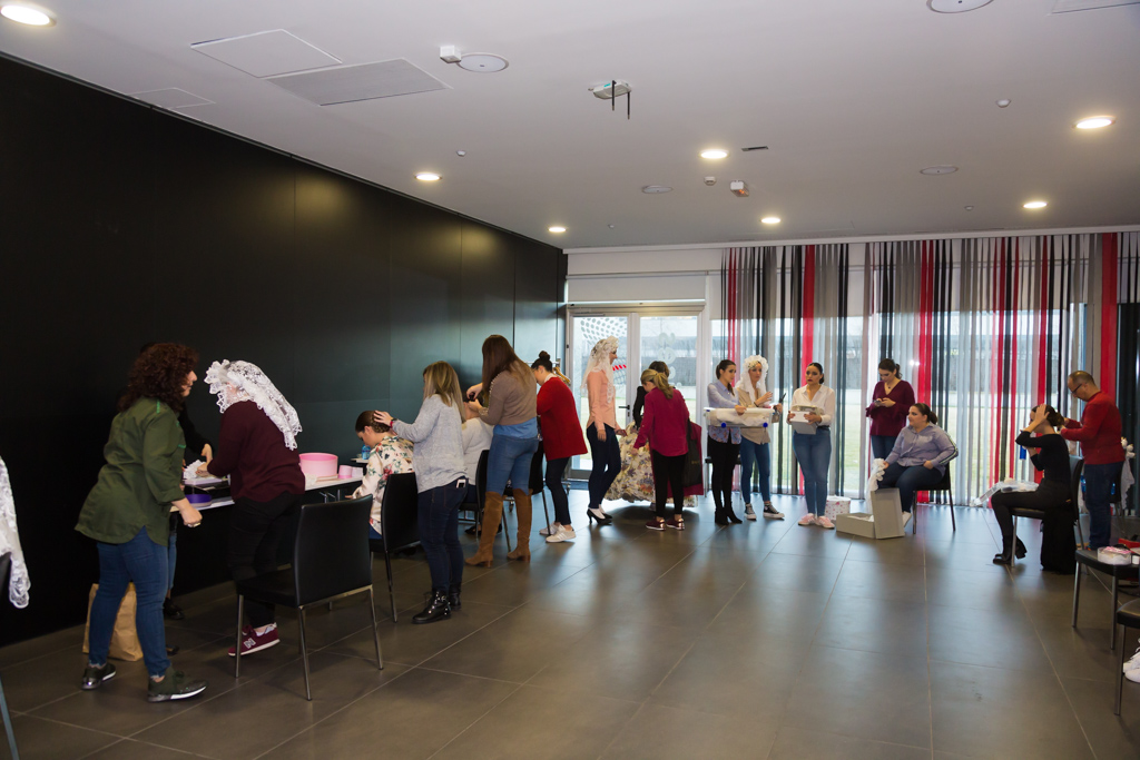 Una vez finalizado el acto institucional las candidatas a bellesa del foc 2019, junto a los miembros de su jurado elector, se han dividido por los diferentes pabellones de la feria para repartir folletos explicativos de la fiesta alicantina.