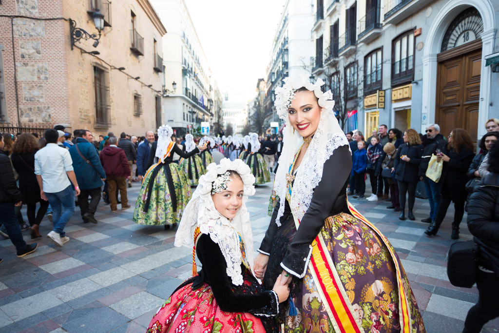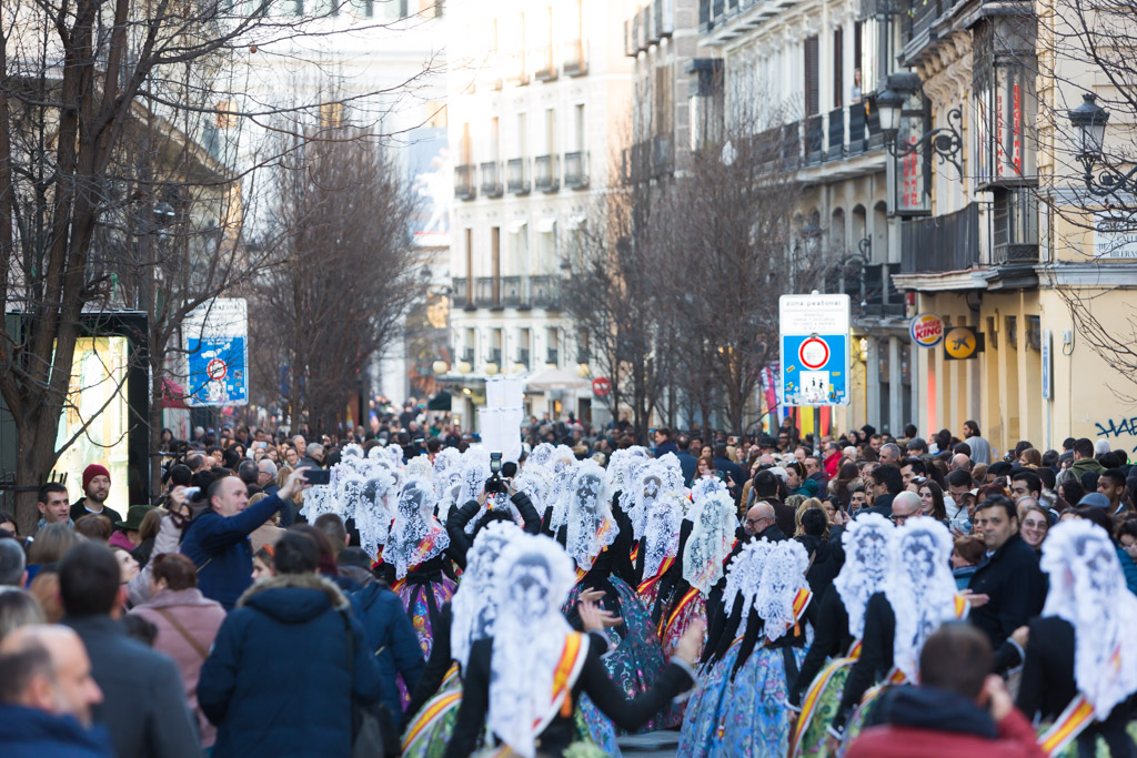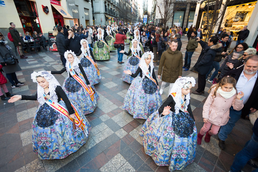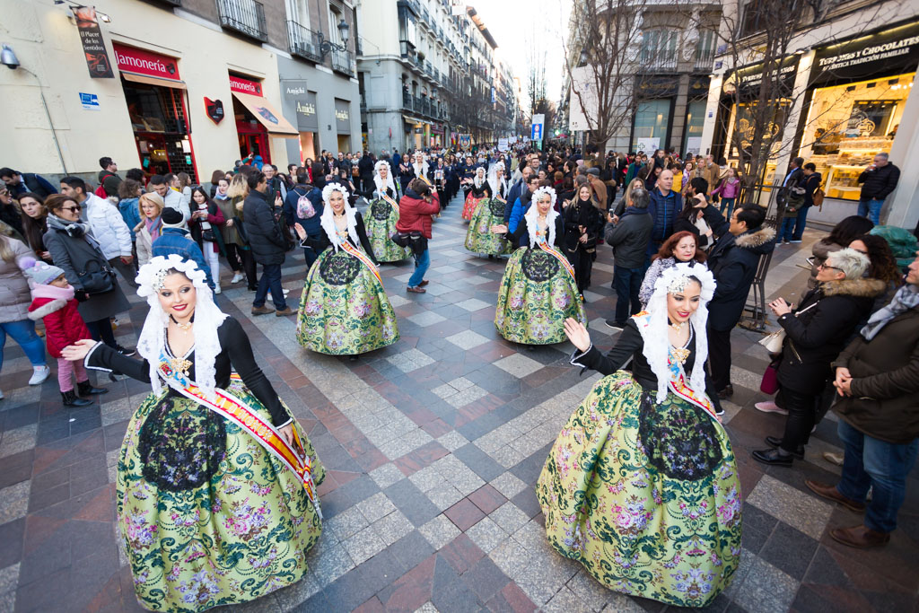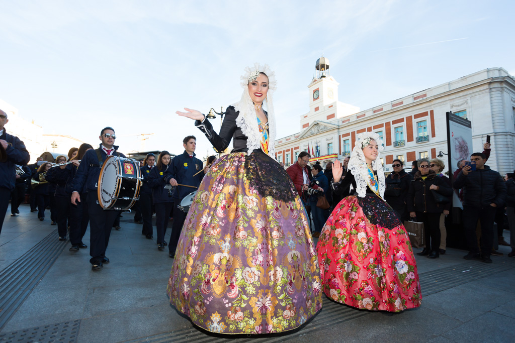 Por la tarde la promoción se ha desplazado al centro de la capital. La plaza de Callao, que desde hace unos días alberga un monumento fogueril, ha acogido a todas las candidatas y a representantes de otras fiestas de la provincia como los Moros y Cristianos o el Carnaval. Desde la plaza de Callao y hasta la plaza de Sol, de paso por la calle Preciados, han desfilado todas las candidatas, las belleses del foc Aleida y Andrea y sus damas.