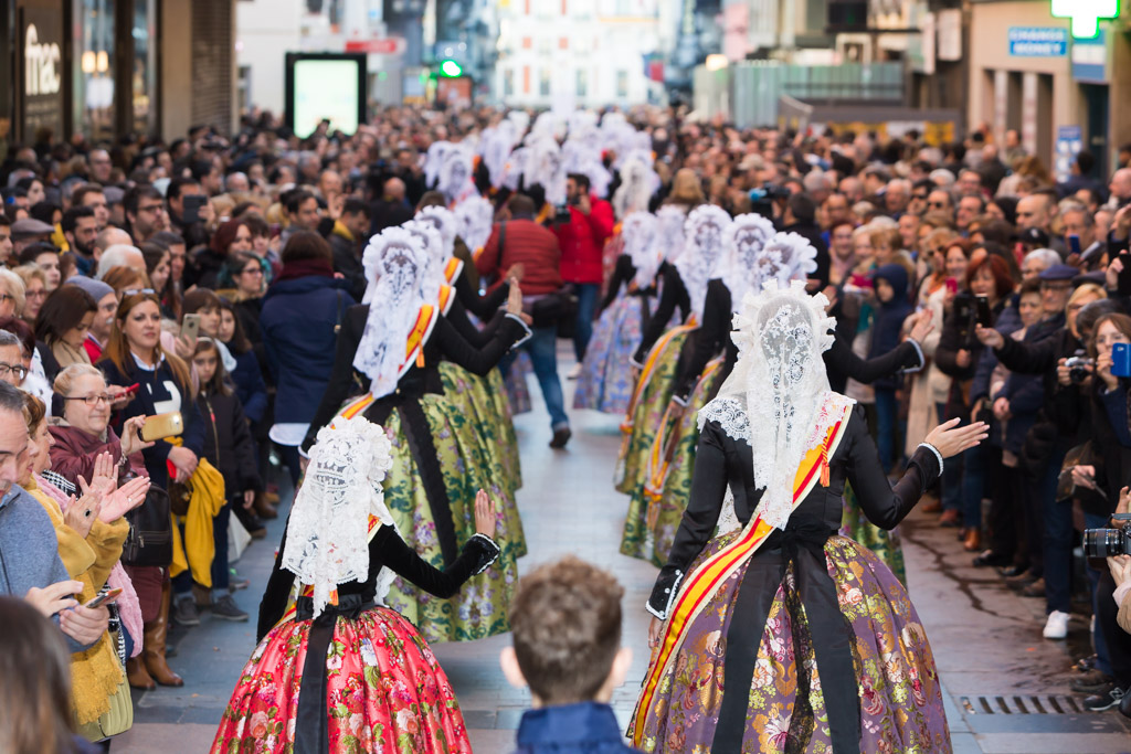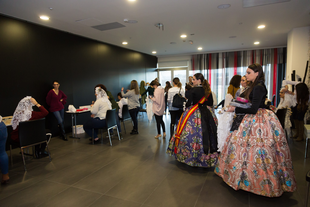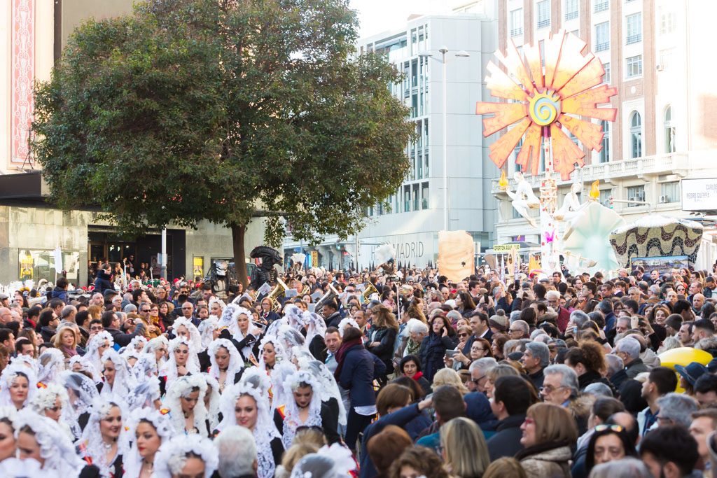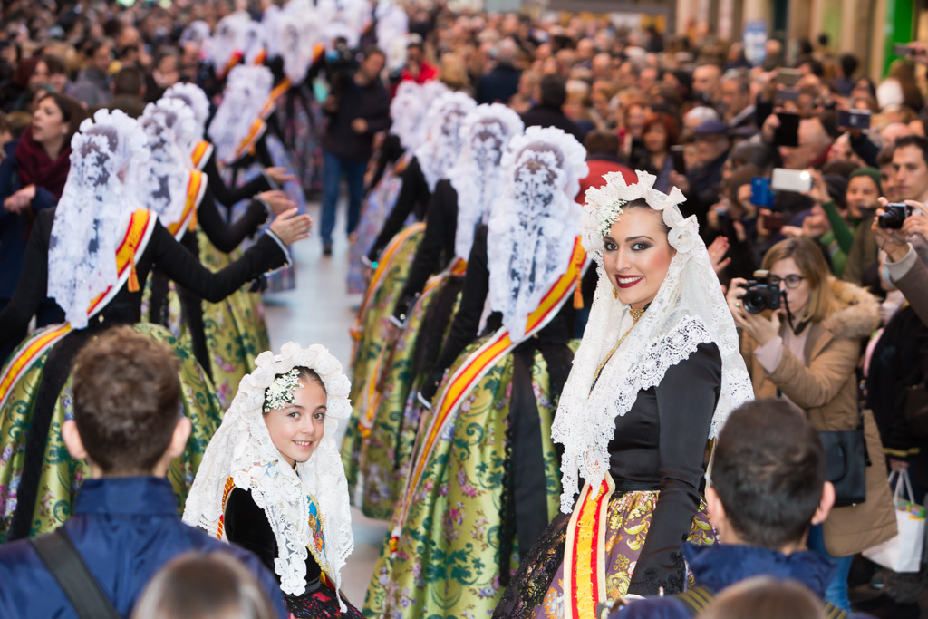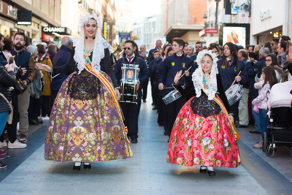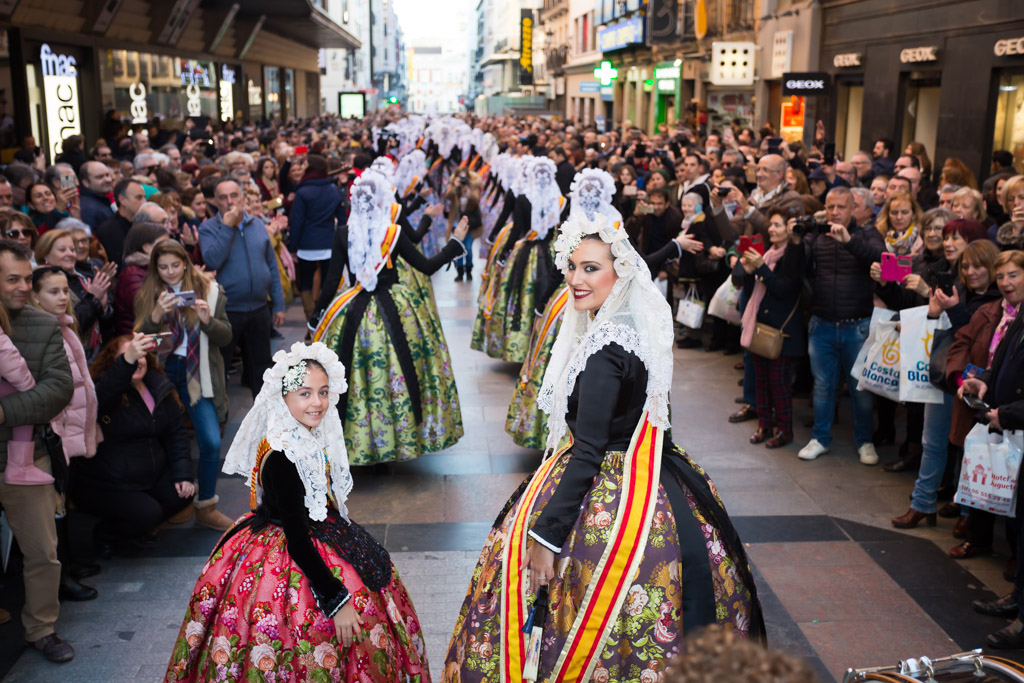 Por la tarde la promoción se ha desplazado al centro de la capital. La plaza de Callao, que desde hace unos días alberga un monumento fogueril, ha acogido a todas las candidatas y a representantes de otras fiestas de la provincia como los Moros y Cristianos o el Carnaval. Desde la plaza de Callao y hasta la plaza de Sol, de paso por la calle Preciados, han desfilado todas las candidatas, las belleses del foc Aleida y Andrea y sus damas.