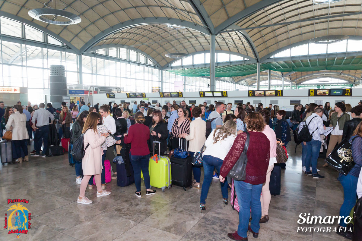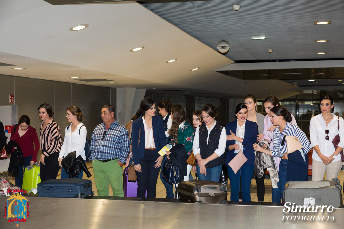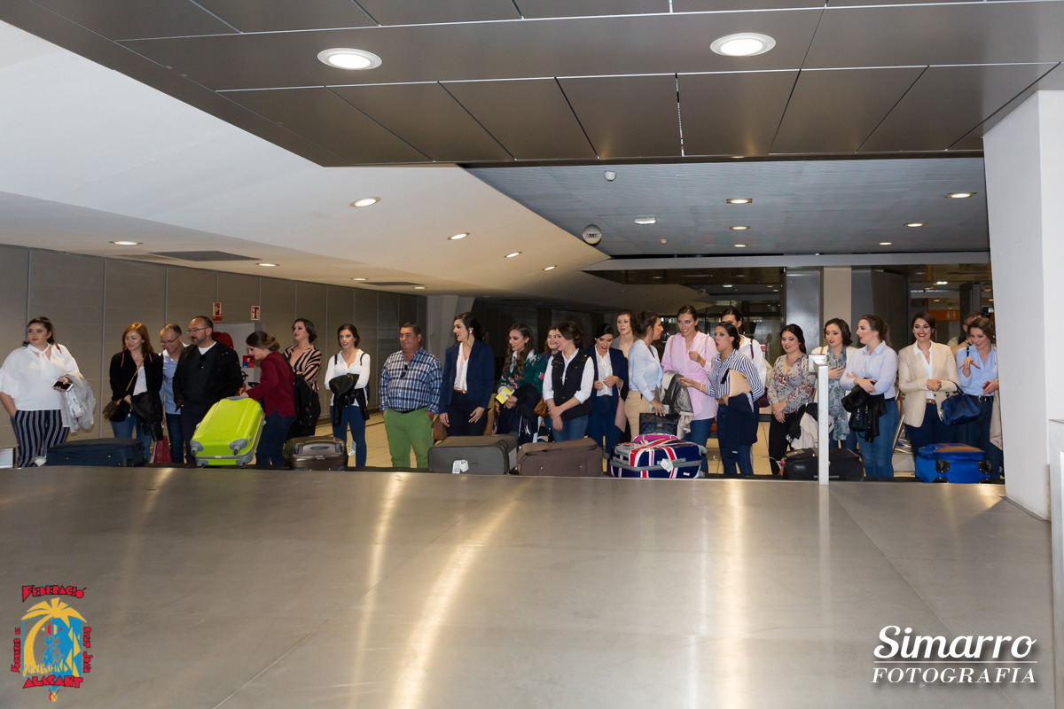 El aeropuerto de Alicante fue el primero en acoger a la expedición alicantina antes de su marcha hacia tierras alicantinas. Allí llegaron Sofía Escoda, bellesa del foc d’Alacant junto a sus dames d’honor, autoridades políticas y las candidatas al título de bellesa del Foc d’Alacant acompañadas por los miembros del jurado.