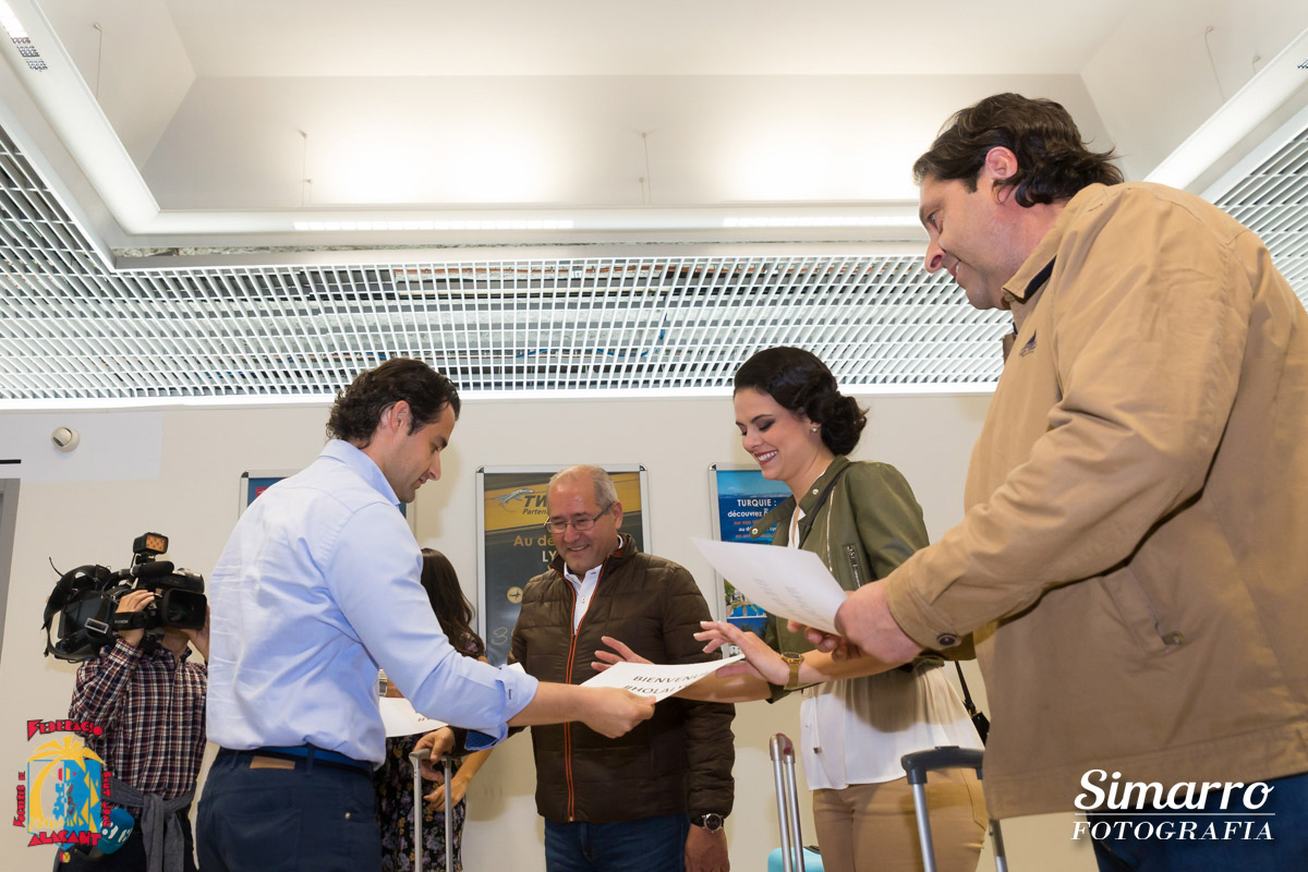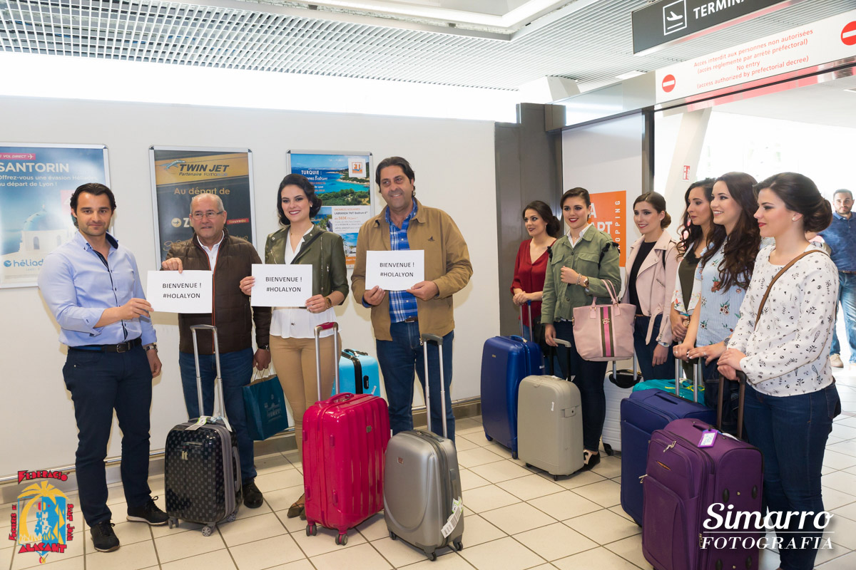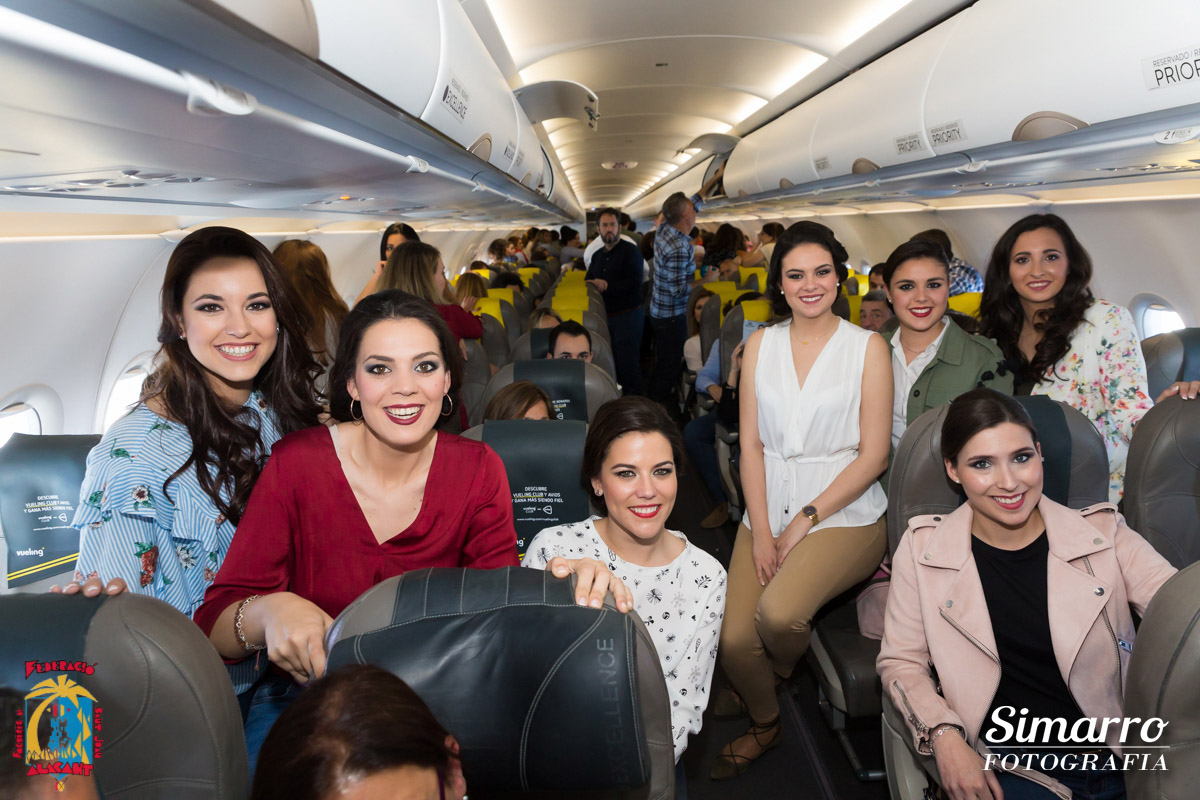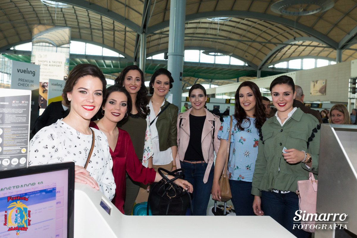 El aeropuerto de Alicante fue el primero en acoger a la expedición alicantina antes de su marcha hacia tierras alicantinas. Allí llegaron Sofía Escoda, bellesa del foc d’Alacant junto a sus dames d’honor, autoridades políticas y las candidatas al título de bellesa del Foc d’Alacant acompañadas por los miembros del jurado.