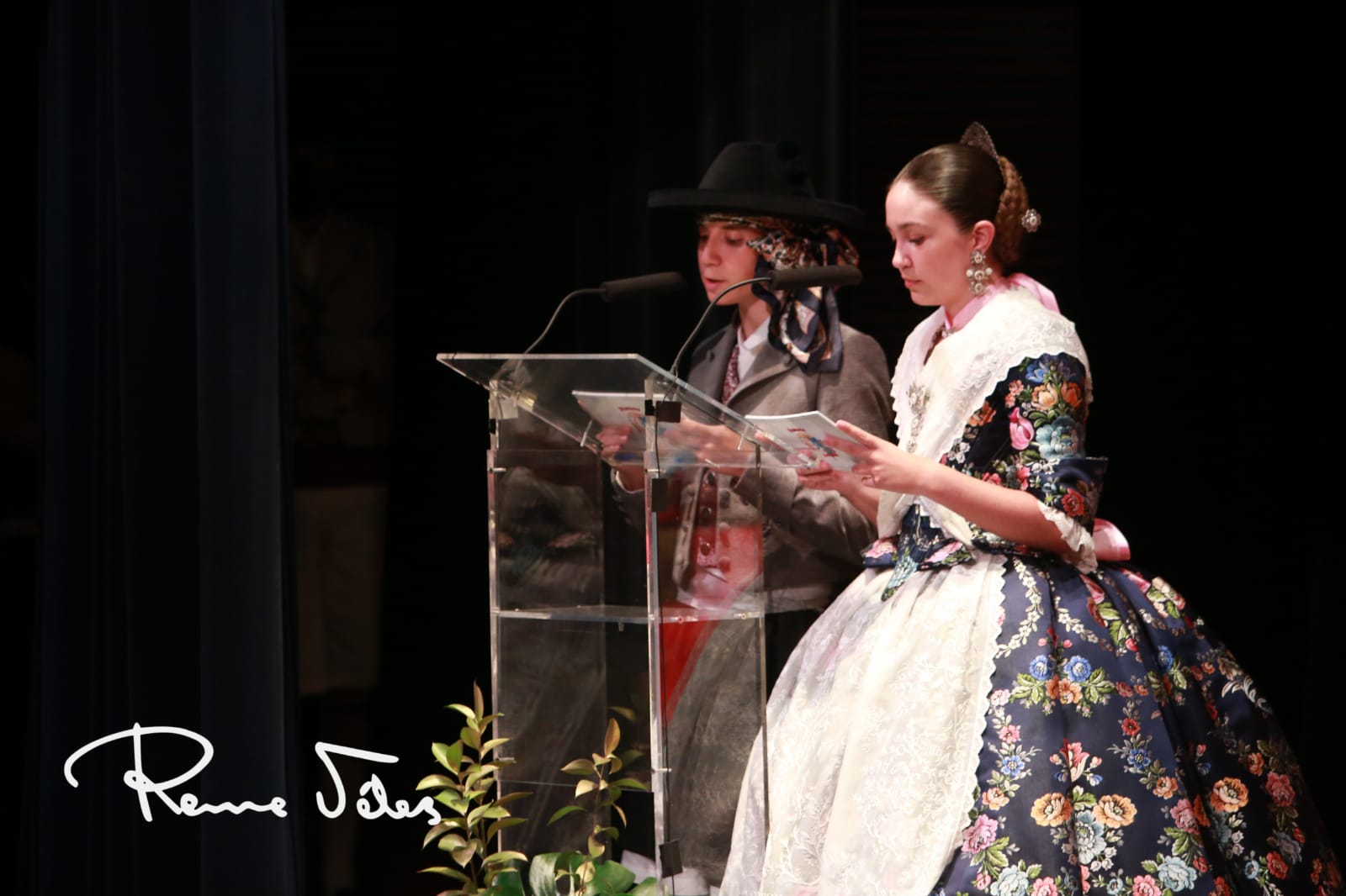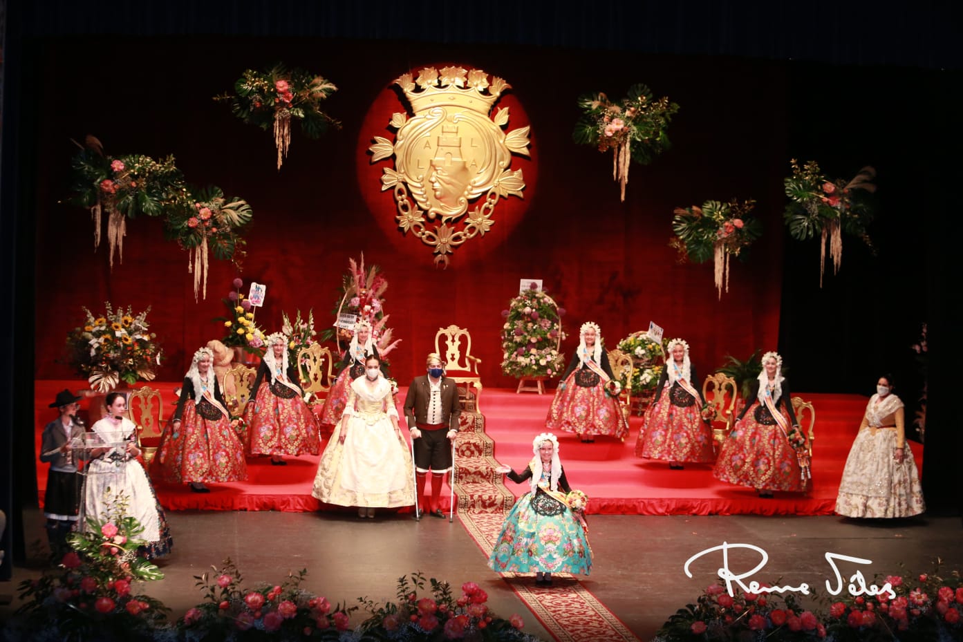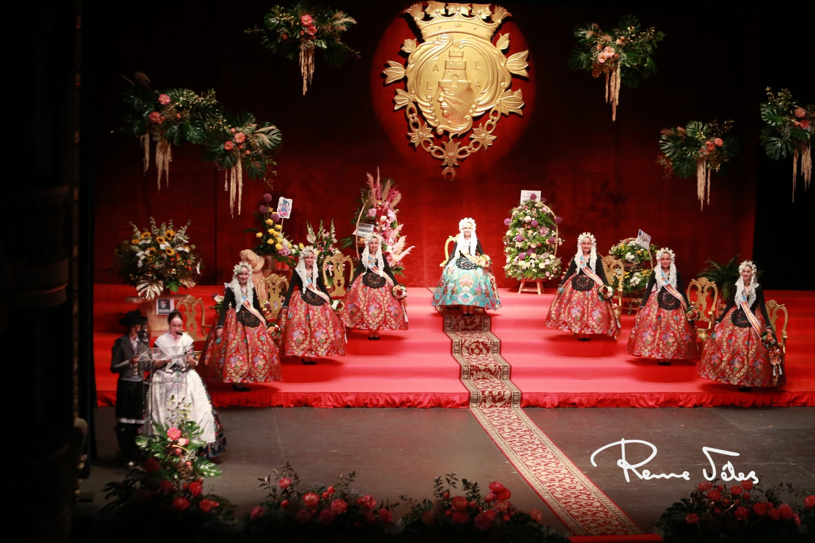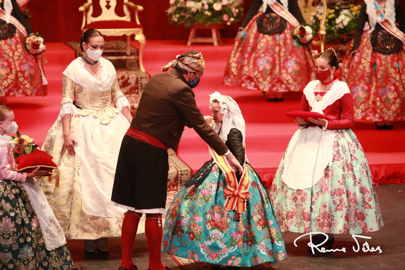 El acto, conducido por Macarena Martínez Palomar de la foguera Calvo Sotelo y Ricardo Martínez Martín de la foguera Parque – Plaza Galicia, ha comenzado con la imposición de bandas a les dames d’honor por parte de la presidenta de la Federació de les Fogueres de Sant Joan, Toñi Martín-Zarco. Las seis han estrenado el primero de sus trajes oficiales, con faldas confeccionadas con el tejido ‘Kronos’ en color Lorca de la firma Vives i Marí.