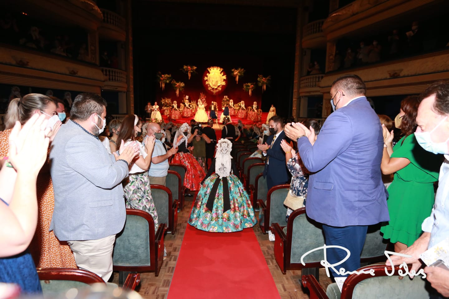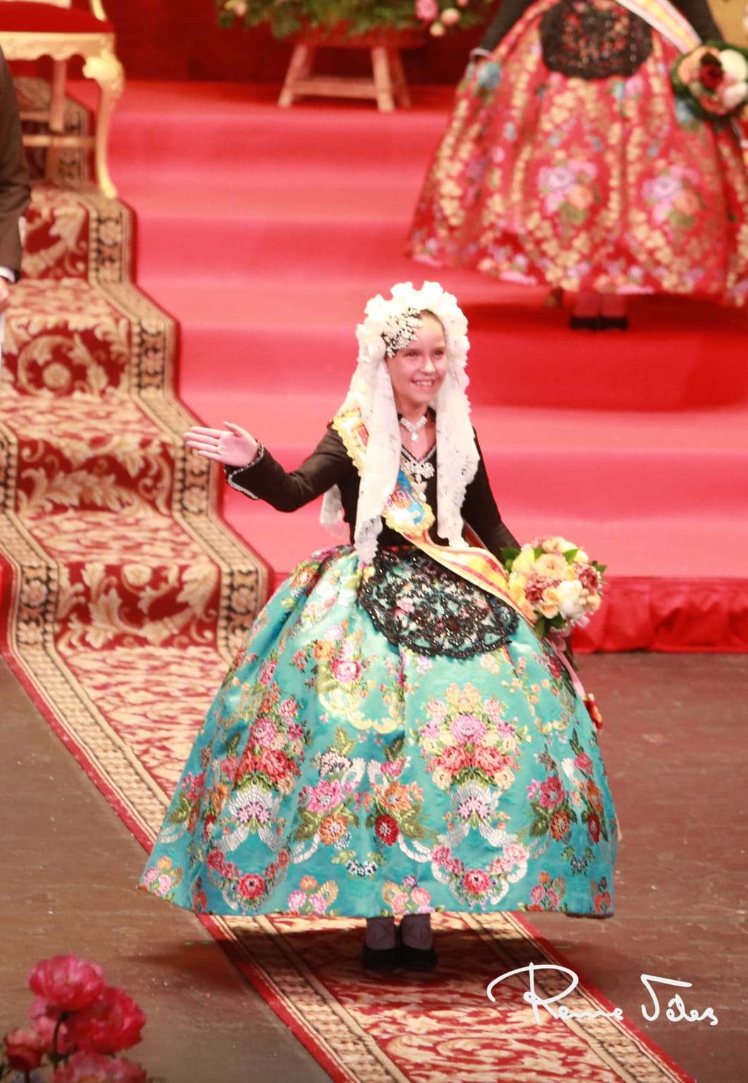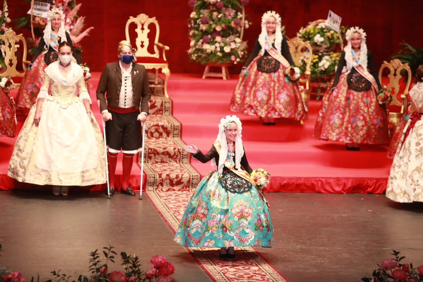 Tras las damas, ha sido el turno de Valeria Gómez, a quien como es tradicional le ha impuesto la banda el alcalde de la ciudad, Luis Barcala. La bellesa del foc infantil d’Alacant iba ataviada con espolín dibujo ‘Bellesa del foc’, creado en exclusiva por Vives y Marí que estrenó ayer Marina Niceto. La falda de Valeria, consta de 50 colores de trama para las flores, 3 verdes en las hojas, 3 metales y 1 algodón de fondo, el tejido de color agua marina.