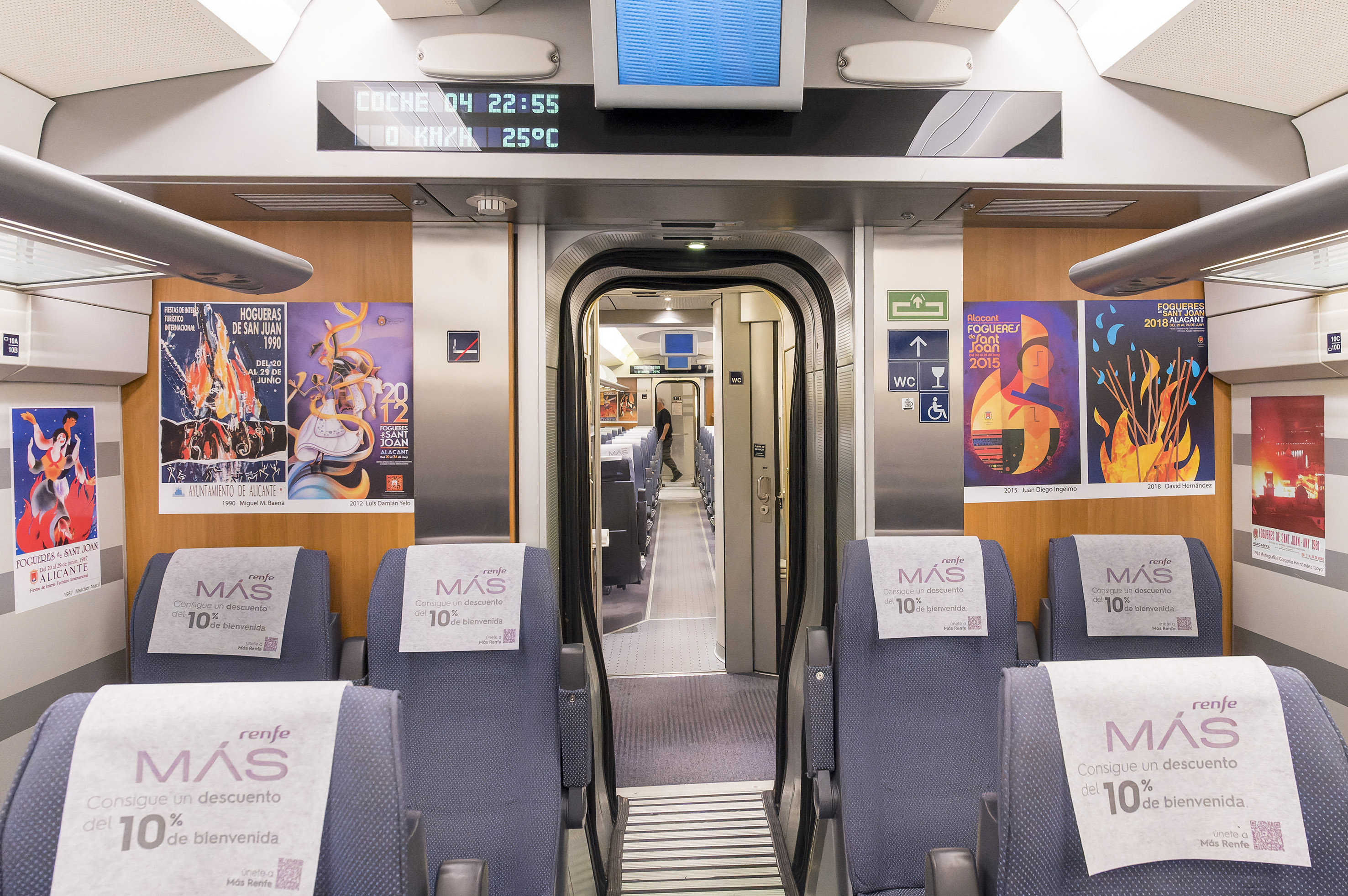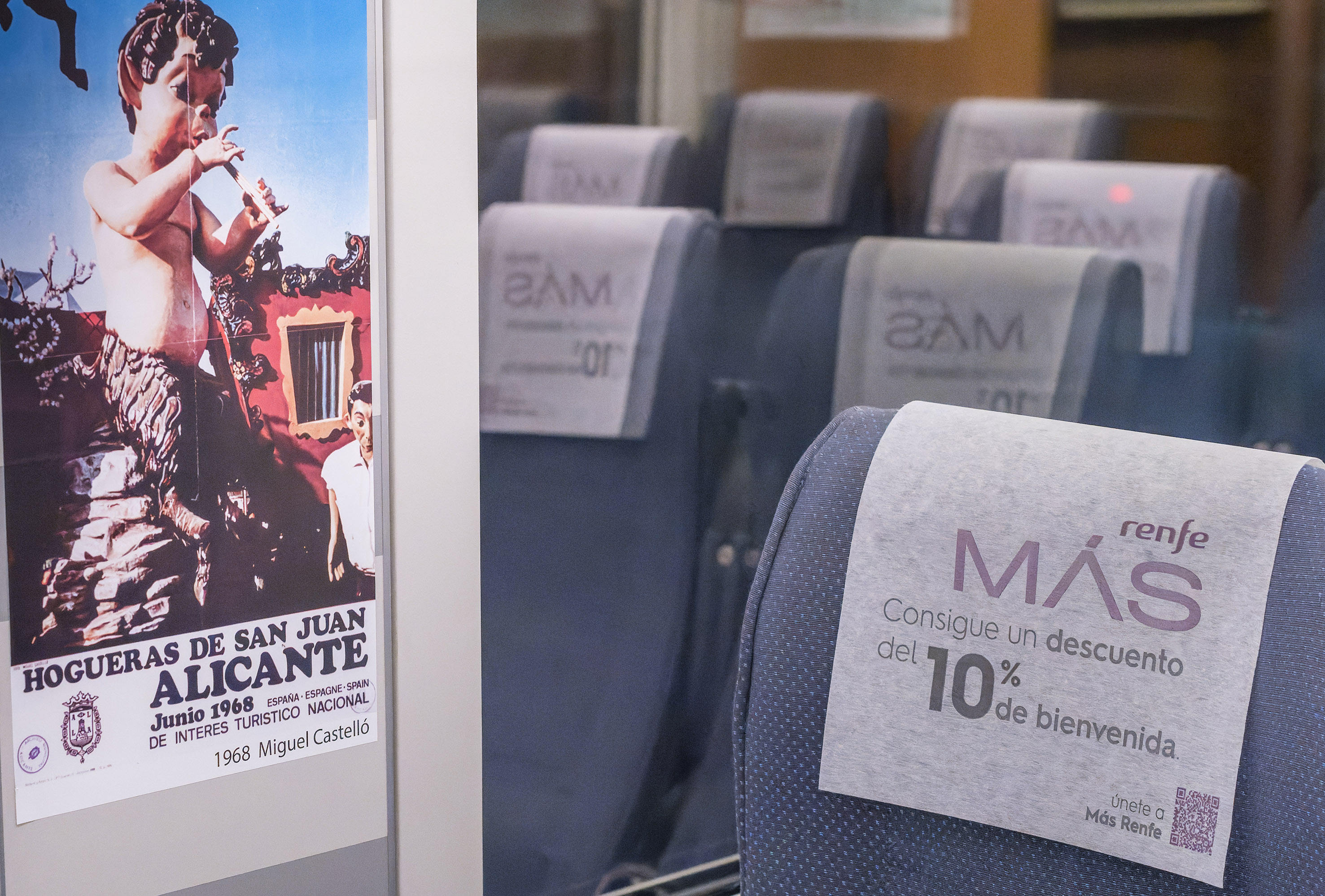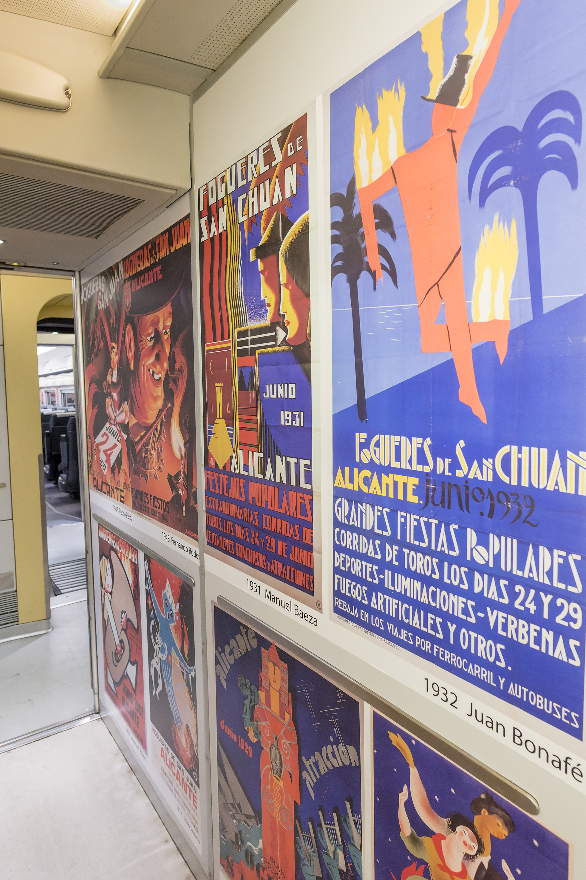 Renfe y la Federació de les Fogueres de Sant Joan presentan desde hoy una selección de casi un centenar de fotografías del mundo de las Hogueras a través de sus carteles en el interior de un tren AVE Alicante-Madrid. La muestra coincide con la celebración de las fiestas mayores de la ciudad y con el décimo aniversario del inicio del servicio del AVE que une ambas capitales.