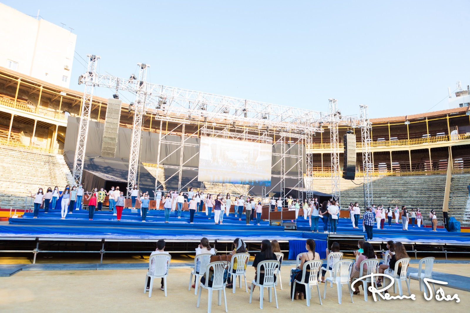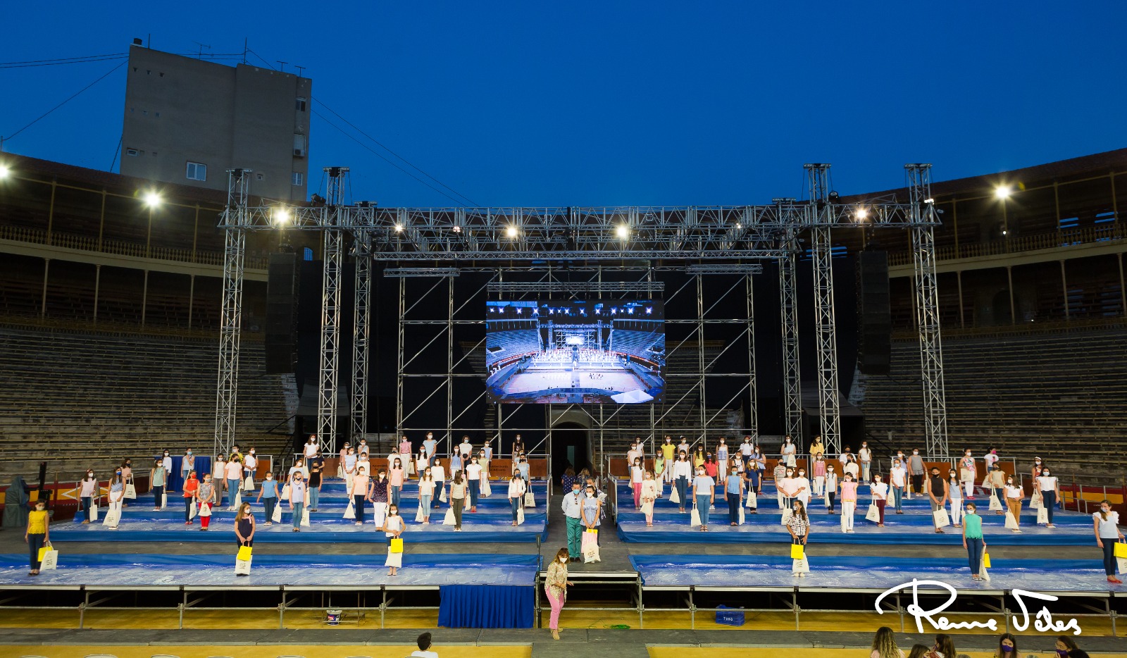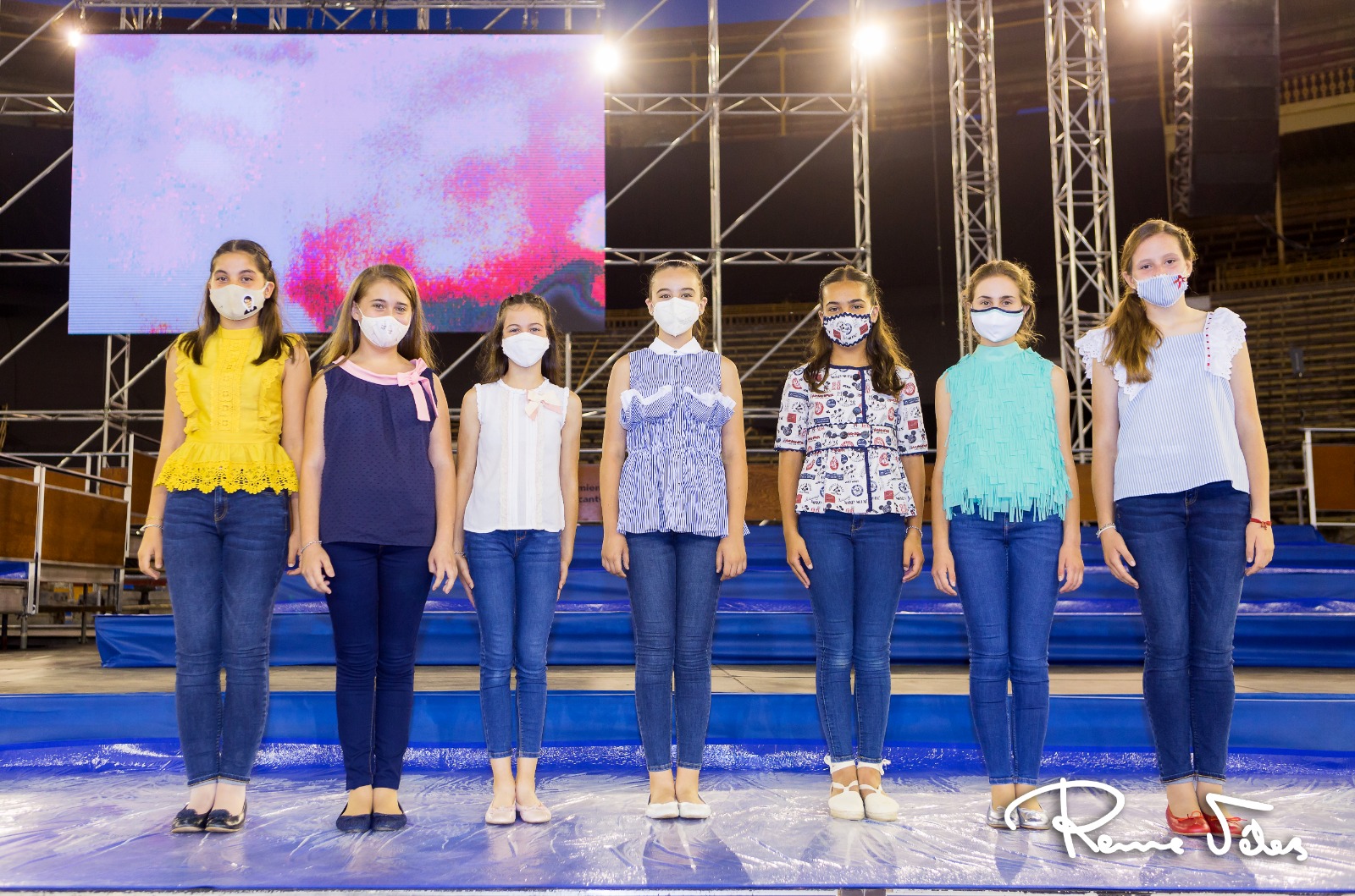 Las candidatas recorrerán casi 100 metros de una pasarela que recorre todo el tendido de forma circular, una forma poco habitual para este acto pero que permite en el coso taurino acercar a las chicas y niñas lo máximo al público. El escenario, sobre el que se colocarán todas a esperar la salida de Isabel Bartual y Noelia Vinal y sus damas, es de 550 m2, y está formado por diferentes escalones. Unas dimensiones más grandes de lo normal para poder garantizar la distancia de seguridad.
